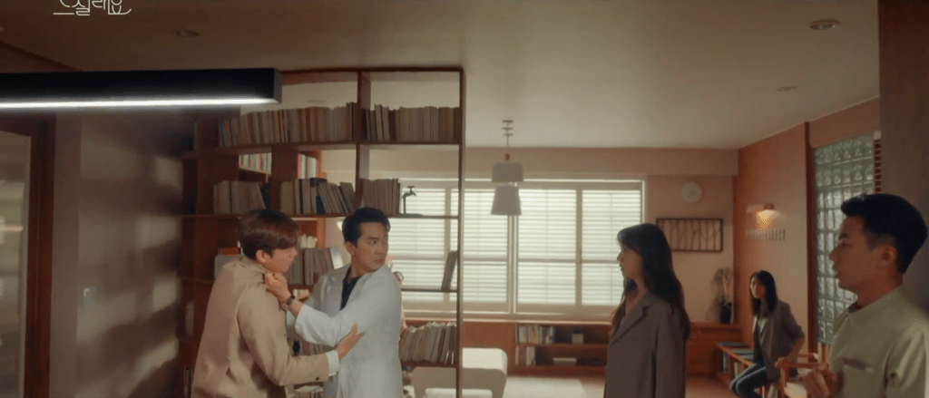 Jae-hyuk does end up meeting with Hae-kyung for a counseling session. He vows to never be like his dad so that’s why he’s especially keen on taking care of Do-hee. Upon hearing his girlfriend’s name, Hae-kyung isn’t sure he can counsel Jae-hyuk. He’s more than happy to recommend another psychiatrist to Jae-hyuk, but the medical journalist remains stern. He wants to be counseled by Hae-kyung. He can’t be turned away, can he? Right as Byung-jin is handling a journalist outside in the lobby of the clinic, he overhears some noise coming from the counseling room. Just then, Hae-kyung drags Jae-hyuk out into the front desk and grabs the collar of Jae-hyuk’s shirt with his hands. He’s angry and furious at Jae-hyuk and demands that Jae-hyuk never show up in front of Do-hee again.