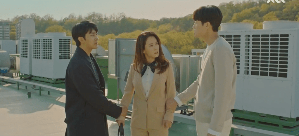 Dae-oh drags Ae-jung to the rooftop of the school building to discuss his feelings to her. Yeon-woo catches up to them and he grabs Ae-jung’s other wrist. The two men confront each other and Yeon-woo takes notice when Ae-jung addresses Dae-oh by his real name. The P.E. teacher recalls the moment when he caught Dae-oh’s name on a music player that once belonged to Ae-jung back in college. Ae-jung distances herself from both guys and suggests to Yeon-woo to head back down to the parents. She’ll figure things out with Dae-oh.