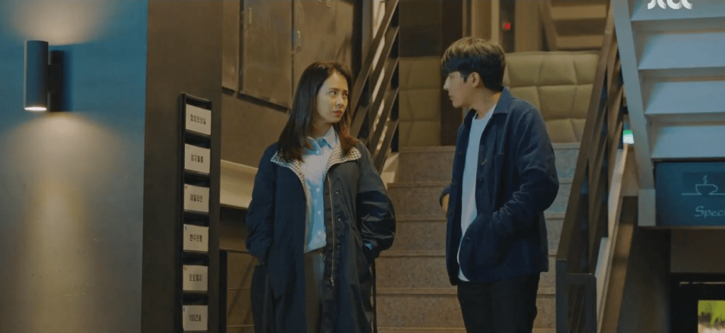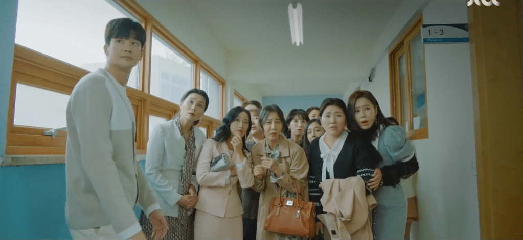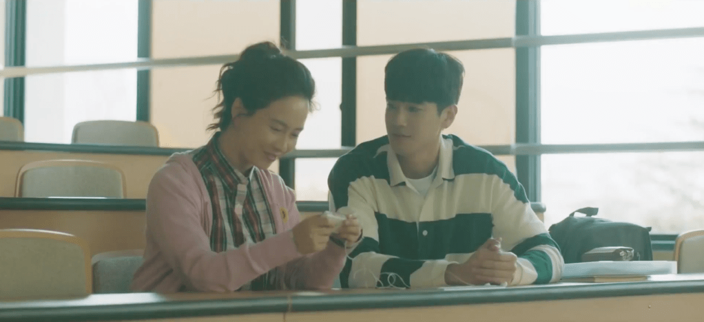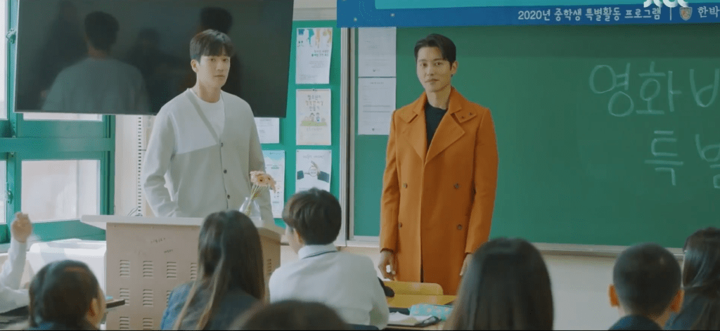 Everyone is super excited and elated with Jin as the guest lecture. The students are curious about his love life and whether he has a girlfriend (in which Jin answers that his fans are his girlfriend hahaha, classic answer!) or who his first love was. Right as Jin is about to answer about his first love, Ae-jung appears at the back of the classroom. The two make eye contact and notice each other immediately. Jin then goes on to describe his first love as someone who inspired him to pursue acting. If it wasn’t for her, he wouldn’t be the grand actor he is in the present. Ha-nee and Yeon-woo also notice the strange exchange between Ae-jung and Jin and they sense that something is up.