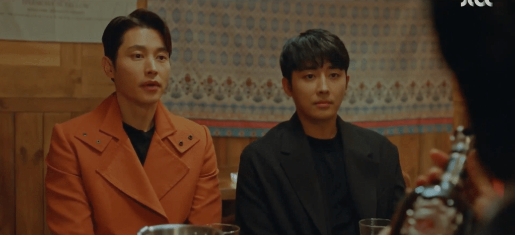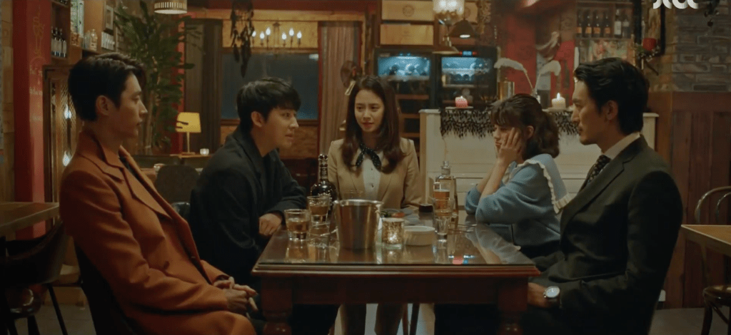 To celebrate the good news with Jin’s confirmation to participate in the movie, Hye-jin and Ae-jung go out to Sook-hee’s bar to celebrate. However, they’re not alone. Also invited is our intimidating but charismatic Pa-do, calm and popular Jin, and funky and funny Dae-oh. AHHHHHH! I love it! Pa-do and Jin exchange greetings with each other and all three become acquainted. While grabbing a bottle of liquor in the back room, Ae-jung and Jin catch up with each other for a short bit. Ae-jung feels thankful with Jin’s decision to participate in her movie. She also feels some pressure, but she’s determined to do well so that she won’t leave a stain on his career. Jin is grateful and happy with the opportunity too and the two are eventually interrupted by Hye-jin who’s already a bit tipsy.