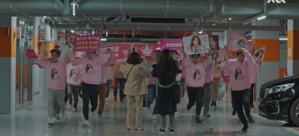 Ae-jung and Hye-jin make their way over to an event that one of the actresses on the list, Joo Ah-rin (Kim Da-som), is hosting at a shopping mall. Although Ah-rin is known as the Angel of Asia, her personality in real life contradicts with her public image and she acts as her true self with her manager, Manager Do Kwang-soo (Oh Hee-joon). After comforting a confused and lost girl at the shopping mall, Ah-rin returns to her van with Manager Do. She pulls out another cigarette to smoke inside the van so he steps out to clear up her tumbler cup (aka her ashtray). However, Manager Do doesn’t get too far until he’s approached by Hye-jin and Ae-jung. They hand him the script to their movie as well as Ae-jung’s business card, but their conversation too is cut short thanks to a bunch of Ah-rin’s ahjusshi fans. Manager Do rushes back inside the van and barely manages to drive away while Hye-jin and Ae-jung get swarmed by the sea of fans. Attempt #1: unsuccessful.