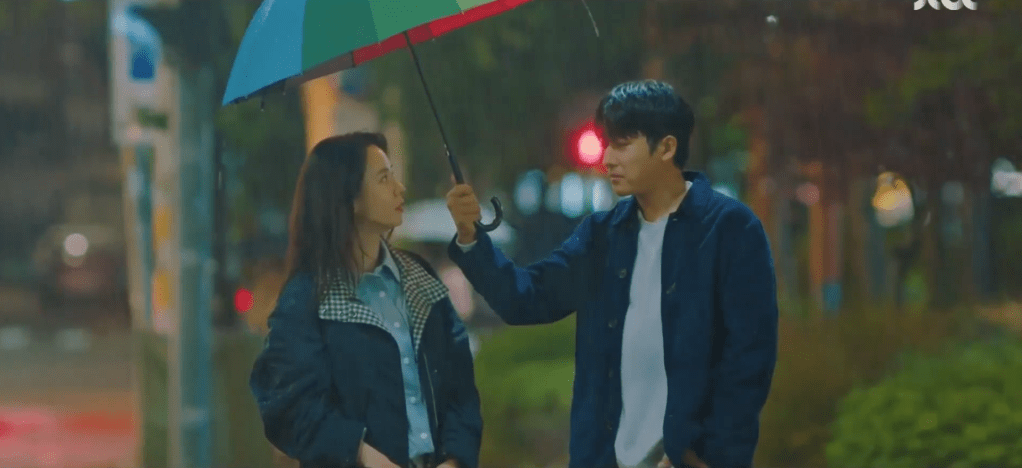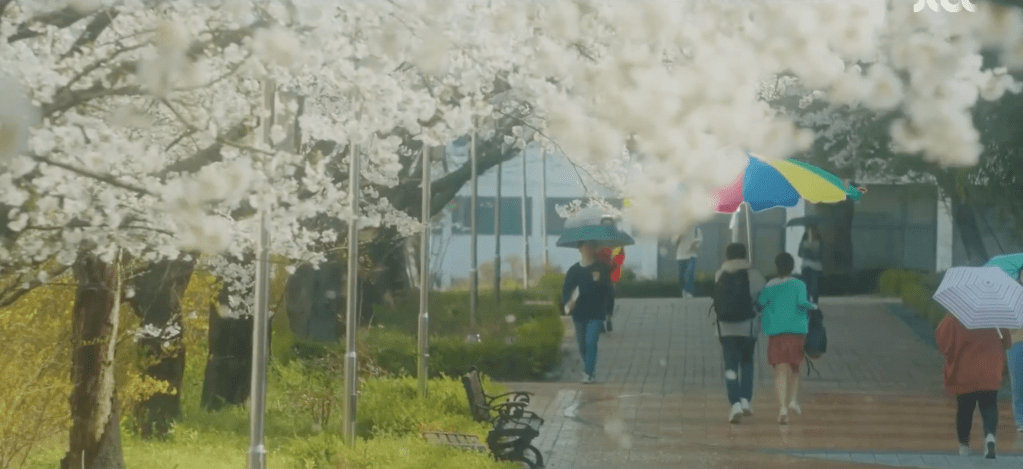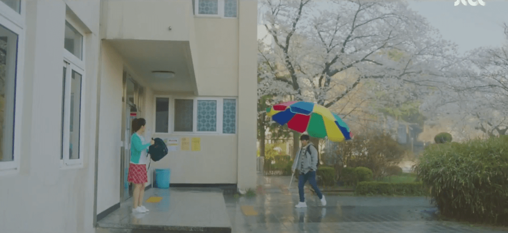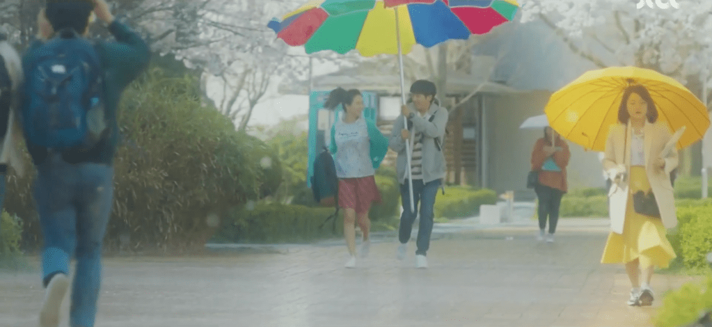 On the bus ride home, Ae-jung is reminded of the specific memory that Dae-oh was referring to just seconds earlier. It was the year 2005 and it was pouring rain on that day. Dae-oh came to her rescue by stealing one of the huge patio umbrellas on campus and using it to protect the both of them from the rain. They ran and ran with the huge umbrella while everyone else had regular umbrellas with them. As silly and ridiculous as this was, it also served as a warm and funny memory for the two and Dae-oh reminisces this specific moment as he drives back home.