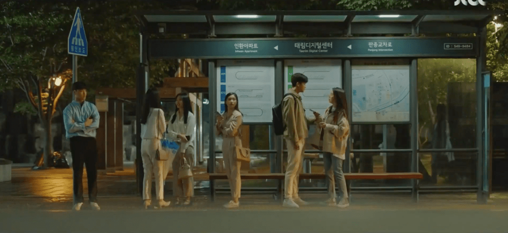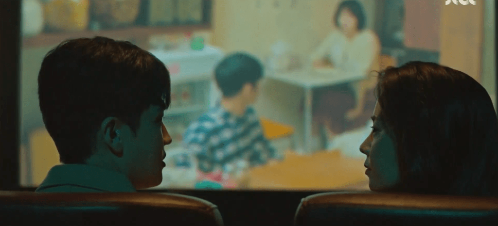 However, Ae-jung can’t be reached since she’s at the movies with Yeon-woo. Yeon-woo is nervous and he pays more attention to Ae-jung than he does to the movie. At one point, he stuffs himself with popcorn to avoid Ae-jung’s gaze and grows even more nervous when she removes a small piece of popcorn stuck on the side of his mouth. After the movie, the two wait at the bus station to head back home. Ae-jung is curious as to what his thoughts on the movie are, but Yeon-woo can’t think properly. He doesn’t have much to say. To avoid the awkwardness, Ae-jung pulls out her phone to contact Grandma to see what she and Ha-nee has been up to. However, Ae-jung notices the number of phone calls that she’s received by Dae-oh which Yeon-woo also notices.