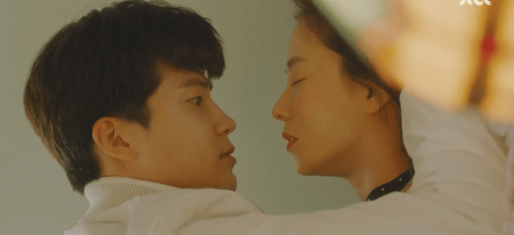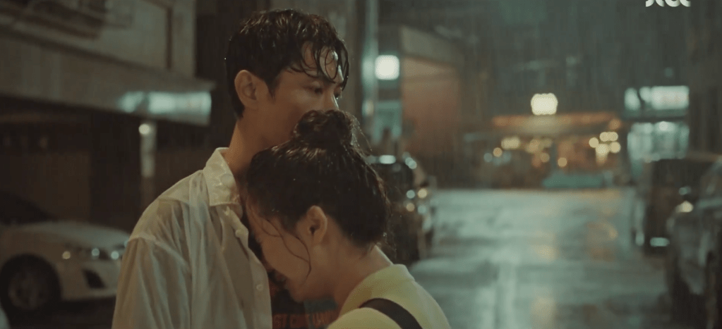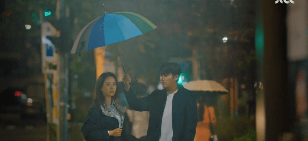 Then after all the bragging came the rain once again (it’s always raining in this drama which makes me think about the type of role that it plays in the show) and Dae-oh rescuing Ae-jung with the umbrella. How hilarious was it when Dae-oh showed up with the huge patio umbrella to protect both him and Ae-jung from the rain back in college? I mean, come on, that scene in itself was SO hilarious and funny and silly and ridiculous, but combine that with Son Ho-joon’s great comedic timing and it just made everything ten times funnier (again, Son Ho-joon is SO good!). I was cracking up watching that scene because of how silly it was. Dae-oh could have just bought an umbrella somewhere on campus, but he decided to steal a patio umbrella for both him and Ae-jung. However, I think that’s also something great about their relationship that the drama was attempting to showcase to us. Dae-oh and Ae-jung might not have had a lot back then, but they were so happy together and created such wonderful and loving memories with each other when they were still in love.