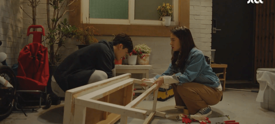 Upon arriving home, Ae-jung catches Yeon-woo fixing a table out on the front patio. Although she tries to avoid the awkward situation at first, Ae-jung gives in to assisting Yeon-woo in the end. While working together to fix the broken table, Yeon-woo reassures Ae-jung to not feel uncomfortable around him. It was never his intention to make her feel uncomfortable. Plus, it doesn’t matter how long it takes for her to get back to him about her feelings. He’s not in a rush. As long as he’s the one who ends up with Ae-jung in the end, that’s all that matters. That evening, Ae-jung is tempted to read the card once again that Yeon-woo had written for her. However, just like before, she puts the card away and instead, focuses on reading one of the poems in the book.