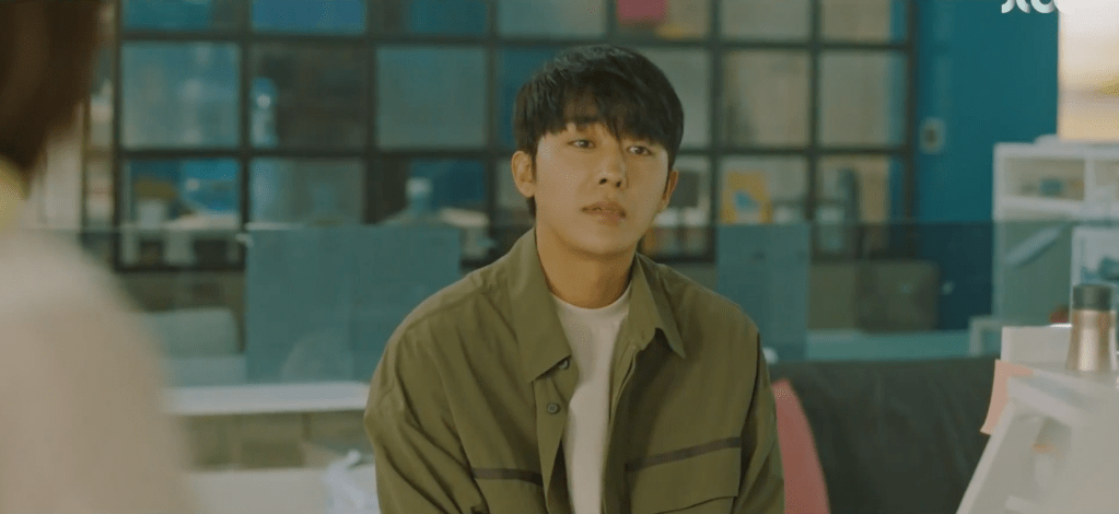 Grandma is relieved and excited to reunite with Yeon-woo when he returns home. She expresses her gratitude to the P.E. teacher and she’s thankful that he takes good care of both Ha-nee and Ae-jung. Yeon-woo doesn’t react much to Grandma’s appreciation and he heads to his room to get some rest. When Ae-jung returns to Thumb Films, Dae-oh reacts indifferently to Ae-jung which she isn’t too comfortable with. He brushes her off during their staff meeting and he strictly focuses on work only. Even Hye-jin notices Dae-oh’s strange behavior and points it out to Ae-jung. Later on that day, Ae-jung and Dae-oh have a small talk about it in the kitchen of the studio. Dae-oh is doing his best to hold himself back from saying or doing anything. He’s well aware that doing what he wants might cause Ae-jung to run away again and that’s not what he wants. He pleads for one more chance to get things right with Ae-jung. This time, he won’t focus on himself, but rather, he’ll help Ae-jung heal from her broken heart. Ae-jung is conflicted at Dae-oh’s proposal and she has a hard time deciding what to do next while waiting at the bus stop.