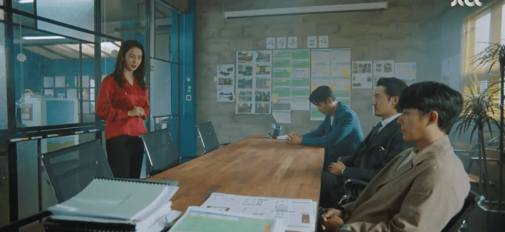 Pa-do plays his part in helping by asking one of his clients to assist in removing all the advertisements from Mr. Na’s website. Doing so would trigger Mr. Na to automatically blame CEO Song and cause him to assume that it was her who broke their deal. Ae-jung’s former boss, CEO Wang, would then swoop in and pretend to be a fake advertiser to serve as bait for Mr. Na. So while CEO Wang works his magic and acting skills on Mr. Na, Ae-jung and Dae-oh wait outside in the hallway where CEO Wang and Mr. Na are having lunch. Dae-oh is curious as to how Ae-jung was able to forgive CEO Wang so easily when he originally scammed her, but Ae-jung has a forgiving heart. Sure, he betrayed her, but he also gave her a second chance at pursuing her dreams which she’s thankful for. Eventually, CEO Wang is able to secretly capture a confession from Mr. Na about the deal that he struck with CEO Song about the news article. Dae-oh threatens Mr. Na with the recording shortly afterwards and puts Mr. Na in his place. Bingo.