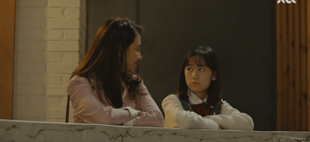 Ha-nee retreats to a nearby neighborhood and begins to cry upon reading text messages from her classmates about Jin being her dad. Dae-oh – who had witnessed Ha-nee walking in the neighborhood – joins the middle school student and they have a brief chatting session. Ha-nee starts off by saying that all she wants now is the truth. She understands that her mother hid the truth to protect her, but her father should also take responsibility for all of this mess too. Ha-nee is so fed up with everything she’s even now exhausted of the word “dad” and wants nothing to do with it. Upon hearing Ha-nee’s honest thoughts, Dae-oh lets out an apology. Although it’s evident as to why he’s sorry, he doesn’t give an explanation to Ha-nee. All he can say is he’s sorry. Aww.
