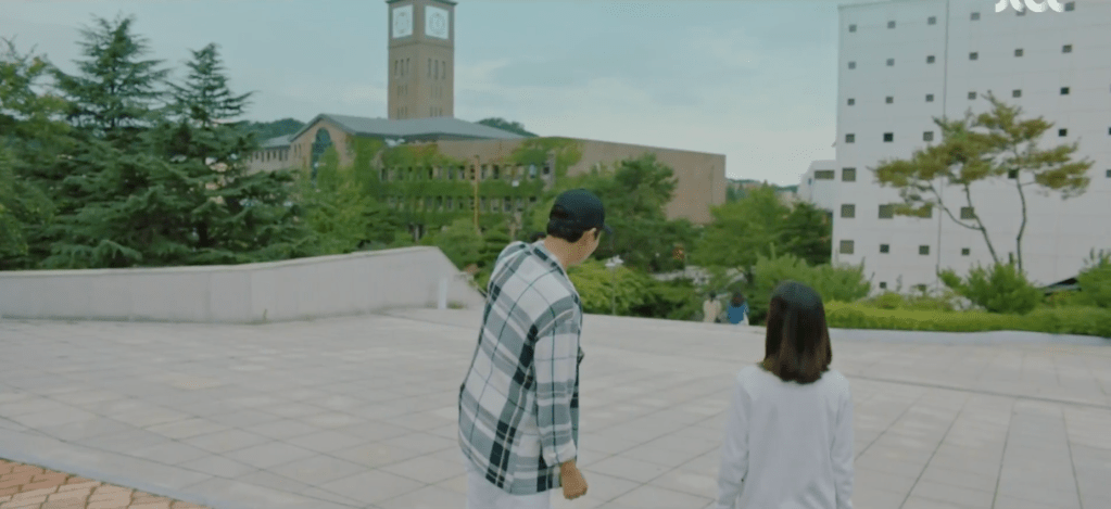 Jin takes Ha-nee on a field trip to the university that he, Ae-jung, and Dae-oh used to attend together 14 years ago. He points out to her different building on campus that they frequented and he also shares some awesome stories about Ae-jung to Ha-nee. Jin also dishes some details about how her parents came about befriending each other in college and eventually becoming that CC couple. Through Jin’s details, Ha-nee imagines Dae-oh and Ae-jung filming videos on campus and even fooling off in class together. Both her parents are so happy in her imagination and she feels a sense of relief thinking about it as well. Jin concludes the college visit by confirming that Dae-oh loves Ae-jung in the present as much as he did in the past. He never abandoned Ae-jung or Ha-nee like they thought.