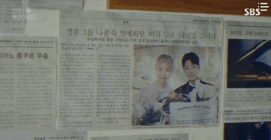 During the break, Hyun-ho bids farewell with everyone as he has a rehearsal to attend. Team Leader Cha, Joon-young, Song-Ah, and Jung-kyung overhear Ji-won getting yelled at by her coach so Jung-kyung checks in with her afterwards. After changing into black clothes to fit in with the theme of the performance, Song-Ah catches Joon-young observing Jung-kyung chatting with Ji-won. Jung-kyung approaches Joon-young afterwards to check in with him. She finds the cloth that she gave him prior to his Chopin performance and notices how he still uses it to this day to wipe down the piano keys before each performance. Through a good look at the piano, Song-Ah realizes that the piano Joon-young is playing on belonged to Jung-kyung’s late mother whose name was also written on the wall back at the Kyunghoo Cultural Foundation building.