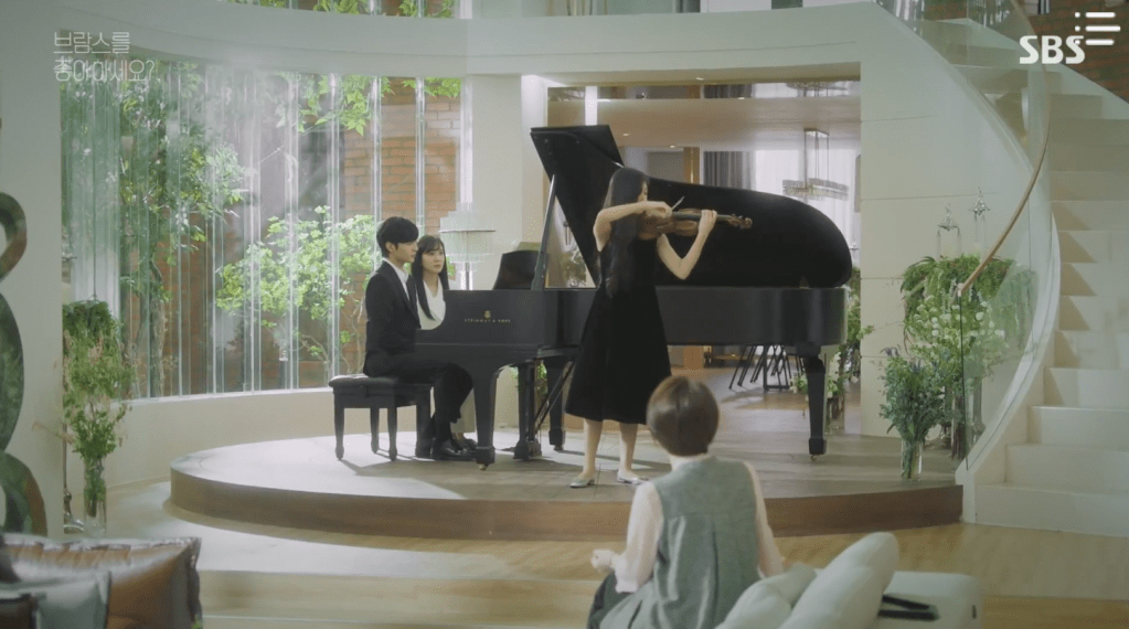 Joon-young arrives at the house where he’s scheduled for another collaboration performance. Song-Ah, Team Leader Cha, and Da-woon too are present at the house and Song-Ah awkwardly greets Joon-young before he goes on to meet his violin partner, Ji-won. Inside her bedroom, Jung-kyung and Hyun-ho spend some time together. While helping put on Jung-kyung’s earring for her, Hyun-ho checks in with his girlfriend to see how she’s feeling. She suffered bad migraines back when she was in New York to the point where she couldn’t even go to Joon-young’s recital. This captures Jung-kyung’s attention and she questions if that was what Joon-young specifically told him, but Hyun-ho answers that it wasn’t. It’s just a conclusion that he came to since he knew just how bad Jung-kyung’s migraines were. It’s not like she went to his New York recital, right? Jung-kyung denies the accusation and they both head out to watch the rehearsal.