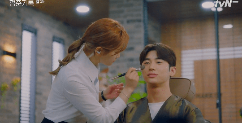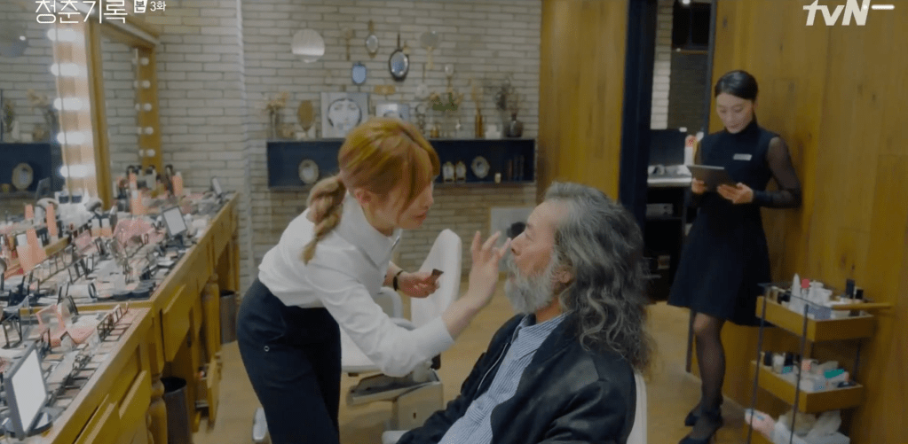 Hye-jun and Grandpa have some breakfast together. They continue to shower each other with support and encouragement and they also encourage the other person to date. But what about Grandpa’s new job? Hye-jun updates that he plans on meeting up with someone later on that day. Hae-hyo stops by the salon to get his make-up done by Jeong-ha for his upcoming drama. Jeong-ha at first declines since she’s only an assistant so she’s not allowed, but the salon director changes the policy when Hae-hyo complains. Jeong-ha will be promoted and she’s permitted to do Hae-hyo’s make-up. Of course, this doesn’t sit well with Jin-ju who receives a scolding from the director. While doing his make-up, Jeong-ha chat with Hae-hyo about Hye-jun. He first attempts to create a conversation by complimenting her on her make-up skills. However, when she doesn’t respond, he changes things up by bringing up Hye-jun. Jeong-ha has always been a fan of Hye-jun’s even before she met him; she still is his fan but she’s trying not to develop feelings for him. Doing so would cause her reality and fantasy of him to clash and that’s not something she wants (a realistic fangirl?! We love to see it!).
