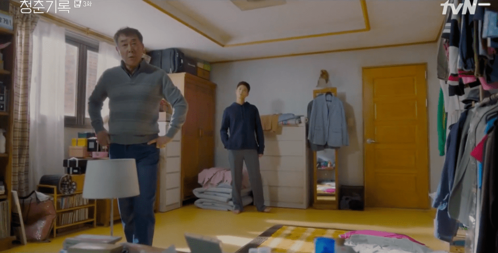 Dad fixes up Grandpa and Hye-jun’s broken bedroom door. When Mama Hye-jun arrives home, Dad automatically scolds her for arriving home late, but Mom’s not in the mood to talk to Dad. She was out working and she’s fed up with Dad’s behavior. Grandpa and Dad bicker with each other (once again) before Dad enters his bedroom to check in with Mama Hye-jun. Dad wants to know why Mama Hye-jun is so upset and angry at him, but he’s left clueless and guessing with Mama Hye-jun’s glares and warnings. Haha. Dad must remain patient.