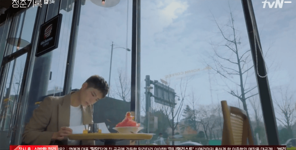 Inside the coffee shop, Hye-jun video calls his Grandpa and the two chat for a bit. Grandpa first checks in on how Hye-jun is doing with his job search and then is introduced to Jeong-ha afterwards who he finds pretty. The video call concludes after just a few seconds and Jeong-ha follows up with Hye-jun about Grandpa. Hye-jun shares that Grandpa is handsome and tall for his age, but couldn’t go into acting since he got scammed during that time. However, he’s in search for a job and Jeong-ha has to remind Hye-jun that it’s definitely possible.