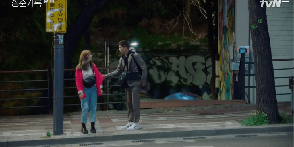 However, it seems as if it’s been an eternity when it comes to Jeong-ha’s drunk habits. While walking back home, Jeong-ha receives a phone call from Jin-ju and she rants about her co-worker to Hye-jun. Jeong-ha’s good at her job and clients like her so she can’t quite understand why Jin-ju is targeting her and making her seem like the bad guy? Jeong-ha is so upset and drunk she almost runs into the street, but is thankfully pulled back by Hye-jun in time (thank goodness for Hye-jun and thank goodness there’s no Truck of Doom!). It’s too much for Jeong-ha and she breaks down in front of Hye-jun. Maybe she did something to trigger Jin-ju to target her and point her out; it’s not like someone bullies someone else just for fun, right? There must be a reason as to why Jin-ju keeps outing Jeong-ha, right? Hye-jun is shocked at Jeong-ha’s breakdown, but he cheers her up by doing the same exact thing she did to him earlier. He makes a pun using his name and does the sign of the cross on Jeong-ha to forgive her (since his name sounds similar to the word forgive). After staring at each other for a few seconds, Jeong-ha lightens up and it confuses Hye-jun. The two eventually walk off together.
