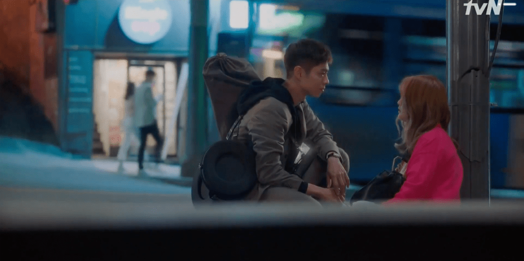 Hye-jun and Jeong-ha exit the bus together and hides under a convenience store to protect themselves from the rain. A conversation about likes and dislikes ensues and the topic of dating and relationships is brought up. Jeong-ha admits that she’s never loved anyone before in her life. She’s not picky but rather just a difficult person when it comes to relationships and she’s really only been a fangirl all her life. A fangirl with a bad drinking habit equals sadness to Jeong-ha. She also feels as if the person whoever receives Hye-jun’s love will be lucky. Of course, she wasn’t implying anything, but wouldn’t it be nice if she was that person?