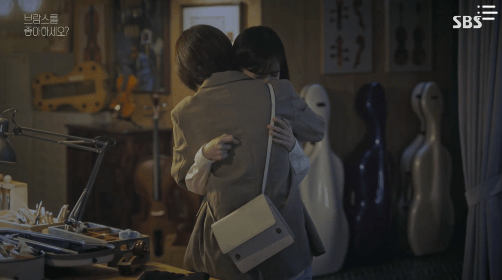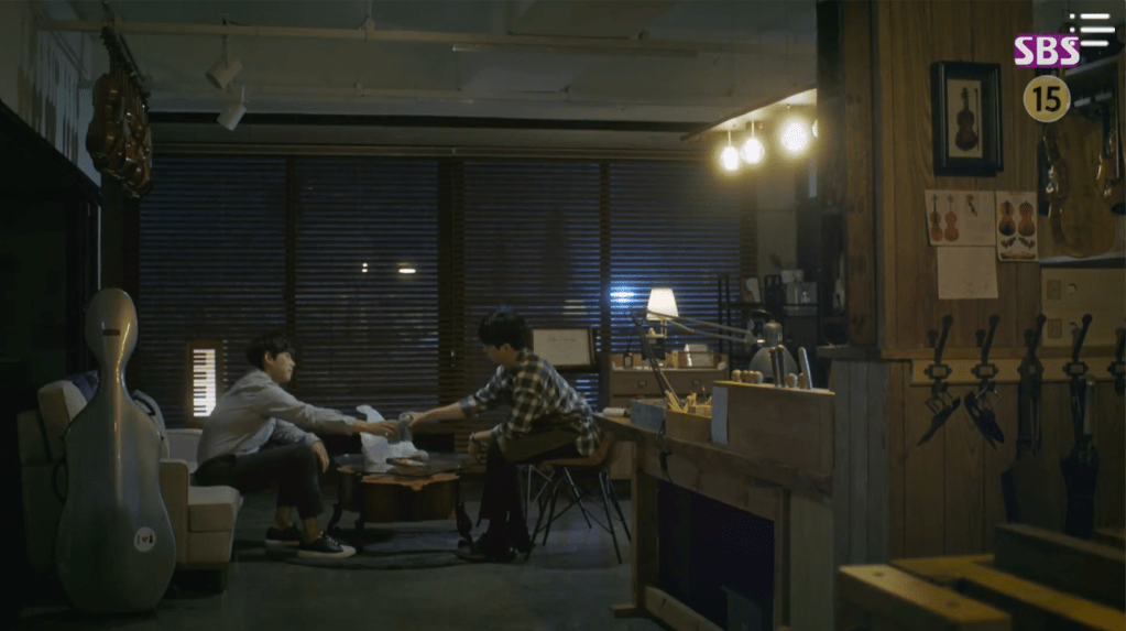 Song-Ah visits Dong-yoon later on that night at his workshop to get her violin fixed. He can tell that something is off with Song-Ah so he steps outside to do something. That something turned out to be just exactly what Song-Ah needed and Min-sung shows up to the workshop not too long afterwards. Song-Ah cries upon reuniting with her best friend and the two give each other a tight hug. Dong-yoon hides outside of his workshop to give the two friends some room and time to themselves (huuuuge kudos to Dong-yoon for doing the right and smart thing! I love it!). So with some help and support from Min-sung, Song-Ah meets with Joon-young that night to talk to him. She cuts to the chase and admits that she wants to stop seeing him. She wants to break up. She wants to end things.