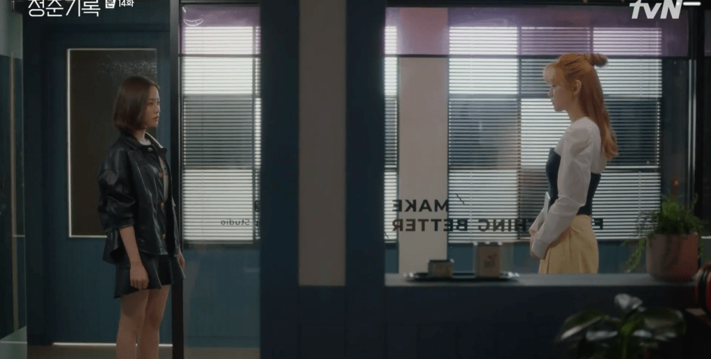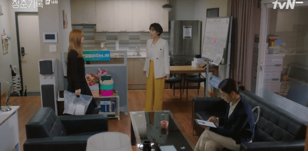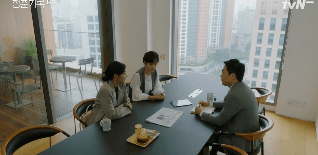 Min-jae meets with Ji-Ah to go over their next steps and she still plans on taking legal action against the reporter as well as the company behind the headlines. They also agree to proceed with their team meeting scheduled for the next day. To express her appreciation and gratitude, Min-jae prepares some snacks for Ji-Ah at the office, but they’re soon joined by Jeong-ha who also stops by. Min-jae awkwardly introduces the two to each other, but Ji-Ah pretends as if nothing is wrong. They exchange friendly greetings and business cards before Ji-Ah goes about with her day. Jeong-ha voices her support for Min-jae and how great she’s been handling everything. Although there’s no plan set in stone at the moment, Min-jae remains optimistic. She also notes just how much Hye-jun loves Jeong-ha. Even when he has a short break, he always spends it by visiting Jeong-ha. Jeong-ha is grateful for the love, but that’s also another reason as to why she’s hesitant to be in relationships. She rather be the one who loves more than the one who receives the love.