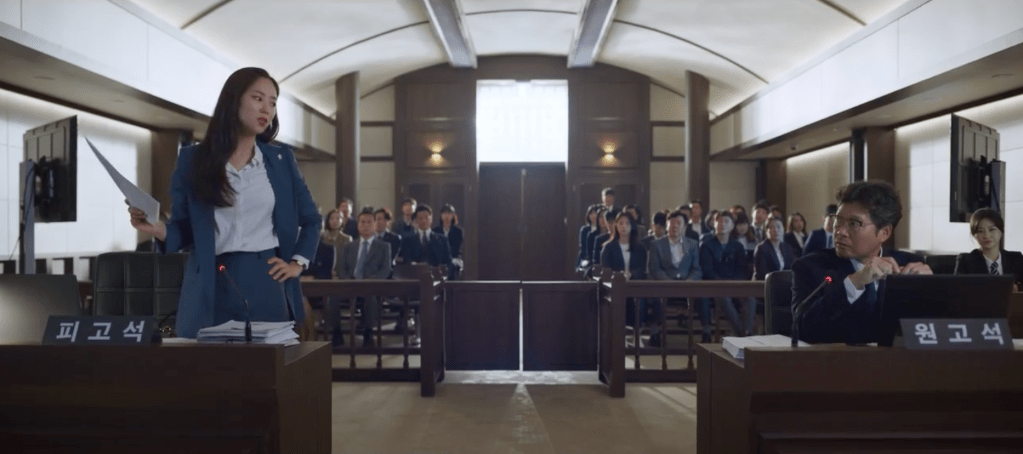 Lawyer Hong Cha-young stops by to visit a man who was once a test subject for conglomerate Babel Pharmaceuticals, a top client of the law firm that she works at. It’s obvious it’s not her first time doing such a thing and she pays the man with some money and cake for the upcoming court case that she’s assigned to. Afterwards, Cha-young waits outside of the courthouse for her intern, Jang Joon-woo (Ok Taecyeon), who is running late and she makes sure to scold him as they enter the courthouse together. It’s a battle between father and daughter as Cha-young goes up against her father, Lawyer Hong Yu-chan (Yoo Jae-myung). Cha-young refutes the claims made that people have died as a side effect of a drug produced by Babel Pharmaceuticals while Yu-chan states otherwise. The two battle back and forth in court, but it is ultimately Cha-young who reigns as the winner. The man who she bribed earlier that day turned himself in for perjury so his statement as a witness is invalid. Everyone is shocked by the sudden news, especially the families of the victims who watch in horror as the situation unfolds.