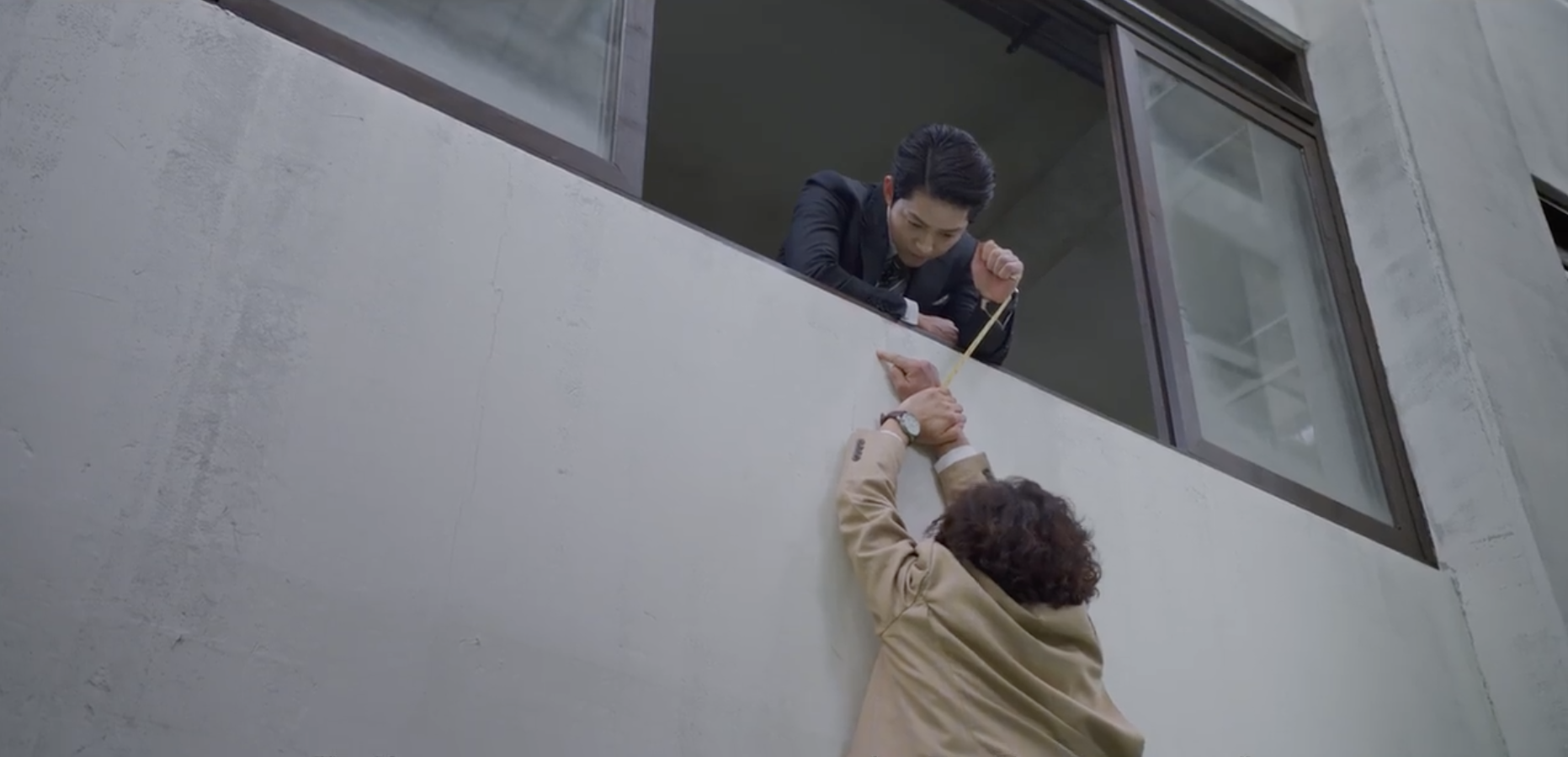 Of course, it’s none other than our Italian prince, Vincenzo, who stands all the way at the end of the hallway. He makes the aisle his runway as everyone’s eyes are on him. He sneakily grabs Mr. Tak’s yellow tape measure on his way to the front of the group and introduces him to everybody (Cha-young is so curious, she recites Vincenzo’s name as ‘Vinchenzo Quassano’ LOL). Vincenzo makes it short and warns the Babel gang to leave. When they don’t take him seriously the first time around, it takes hitting Mr. Jeon and throwing Mr. Park outside over the edge of the building for them to realize the intensity of the situation. Mr. Park is barely hanging on by the thread of the tape measure and while everyone else panics, Vincenzo lets them know who he is. He’s not going to back down and he reiterates that Geumga Plaza belongs to him. Thanks to Mr. Toto’s interpretation of Vincenzo’s Italian comment, everyone ends up giving Vincenzo an applause (LOL). Vincenzo can only smirk upon staring at Mr. Park hang on for his dear life. Surely by now, they all know and recognize who he is.