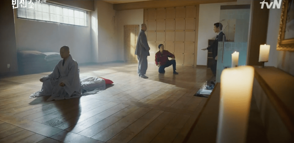 However, things aren’t as easy as they seem in the present now that a temple is occupied right above the storage room. Vincenzo is greeted by Monk Chaeshin and Cheol-wook as the two men approach the temple and it’s then that Vincenzo learns of their plans to install a boiler. Vincenzo grows alarmed at the news and he tries to talk both guys out of the idea. He even offers to purchase some electric pads to heat up the floor and he’ll pay for electricity. He’s desperate to not let anyone touch anything that could expose or affect the storage room down below. He’ll do whatever it takes. Vincenzo’s kindness should be accepted, right? Lol.