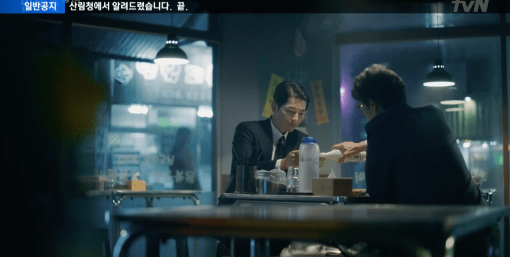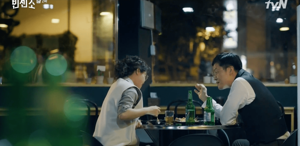 Lawyer Hong and Vincenzo strategize their future plans at Jipuragi. They anticipate that Babel E&C will repeat history and make their move within the next day or two. Just like before, Babel E&C will instill fear in the tenants by demolishing all the non-residential buildings nearby before moving onto the Geumga tenants themselves. Vincenzo and Lawyer Hong seem stuck and uncertain as to what to do. To relieve some of their stress, they go out for some drinks and it’s then that Vincenzo has his first taste of makgeolli. Lawyer Hong teaches the Italian some drinking etiquette and it’s obvious the two men get along the more they spend time together. They have an honest and heartfelt conversation about the feelings of hopelessness, rage, and helplessness that the weak feels and utilizes Ms. Oh as an example. Vincenzo learns more about Ms. Oh and her reasoning to stay as an inmate: she feels as if she’s being punished for abandoning her child in the past. It doesn’t matter that she was falsely accused of murder. She believes she deserves this punishment and that there’s no way of getting out of things.