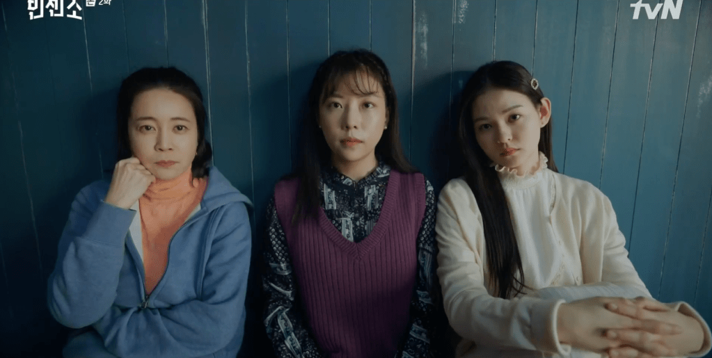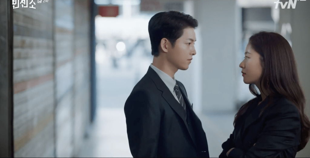 Prosecutor Choi grabs dinner with her boss and a colleague, but the conversation quickly turns sour when she’s assigned another scandal to handle and take care of. It’s obvious she’s frustrated of having to clean up after other people’s mess. Cha-young stops by the Jipuragi office and drags her feet inside initially pretending to look for her lost wallet. However, when she’s quickly discovered to be lying, she seats herself at the table with Vincenzo who’s reading up on Babel E&C as well as Babel Pharmaceuticals. She’s confused at first with the initial sighting and quickly grows flustered afterwards. Vincenzo and Lawyer Hong team up and both take turns criticizing Babel for being bullies and Wusang Law Firm being right there next to them to help them. Cha-young takes offense with all the harsh and brutal comments and she chases after Vincenzo when he exits the law firm. She assumes he’s leeching off of her father to make some profit out of the lawsuit, but the conversation ends there.