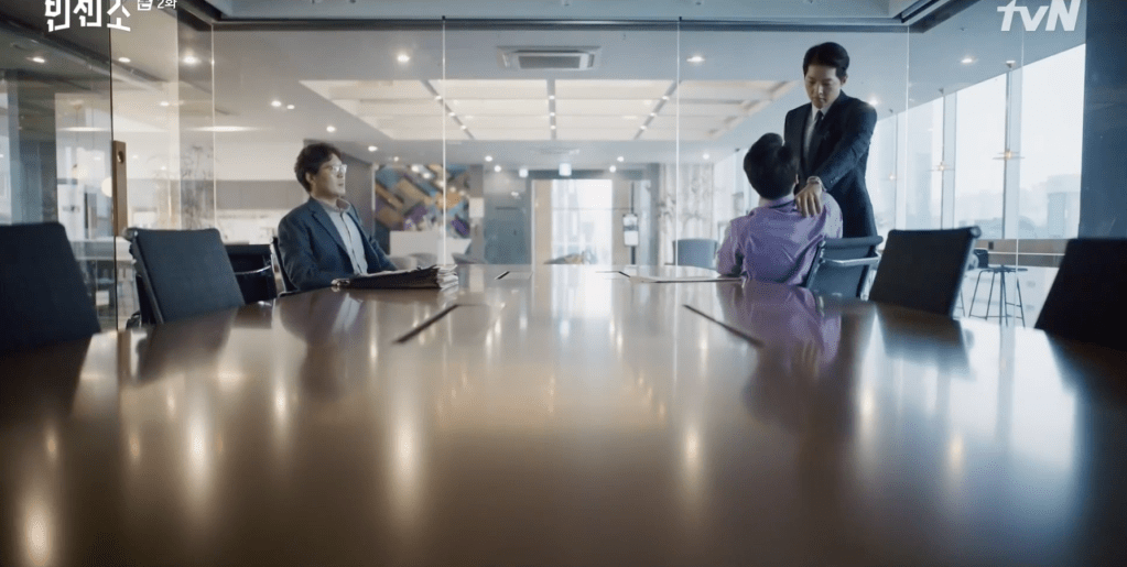 Vincenzo and Lawyer Hong go on a field trip to visit Mr. Na, the team representative from Babel’s development team, who they had met previously with back at Jipuragi’s office. This time, they make the trip to meet Mr. Na at his headquarters and with Vincenzo’s quick thinking and frightening threatening skills, they manage to meet with Mr. Na without having to make a prior appointment. The meeting is sweet and short and Vincenzo threatens Mr. Na to once again leave them alone. He’s not afraid of destroying Mr. Na or Babel like how he used to do to his enemies back in Italy. The threat works in the meantime and Lawyer Hong leaves the meeting impressed with Vincenzo’s skills.