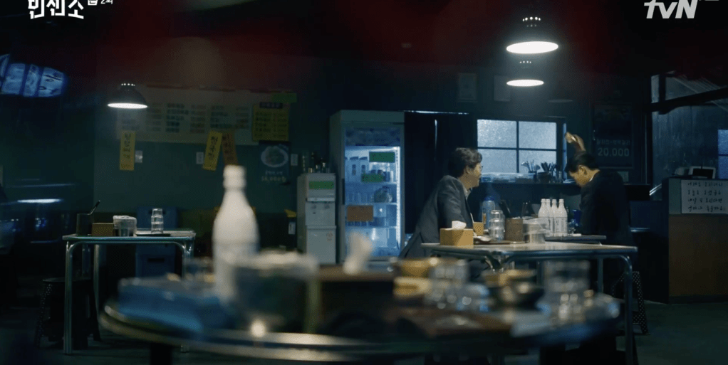 Chef Toto quickly closes his restaurant when he finds Vincenzo and Cha-young approaching nearby. He lies that the restaurant has closed for the day and encourages them to stop by the snack bar down the hallway. Hungry and with no other option, the duo make their way to the snack bar shop. Vincenzo is initially denied any food by owner, Mrs. Kwak, but she gives in when Cha-young joins not too shortly afterwards. They have a plate of tteokbokki and when asked for a glass of water, Vincenzo is instructed in Korean + English to grab it himself, lol.