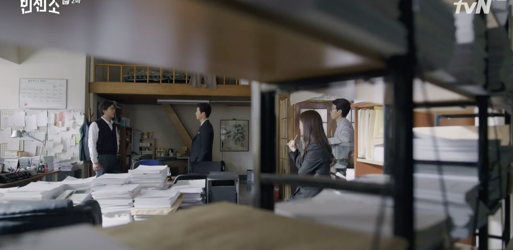 Lawyer Hong dismisses Vincenzo to leave the Geumga tenants alone despite Vincenzo’s claims that Mr. Cho was threatened by Babel E&C to sell the plaza over to Babel E&C. Lawyer Hong refuses to listen to any of it, but Vincenzo also doesn’t back down. He’s going to stay and fight for the building even if no one believes in him. Mr. Nam and Cha-young listen carefully to the conversation nearby and Cha-young too is dismissed by her father. Seconds after Vincenzo exits the office, reporters enter the law firm at the request of Vincenzo.