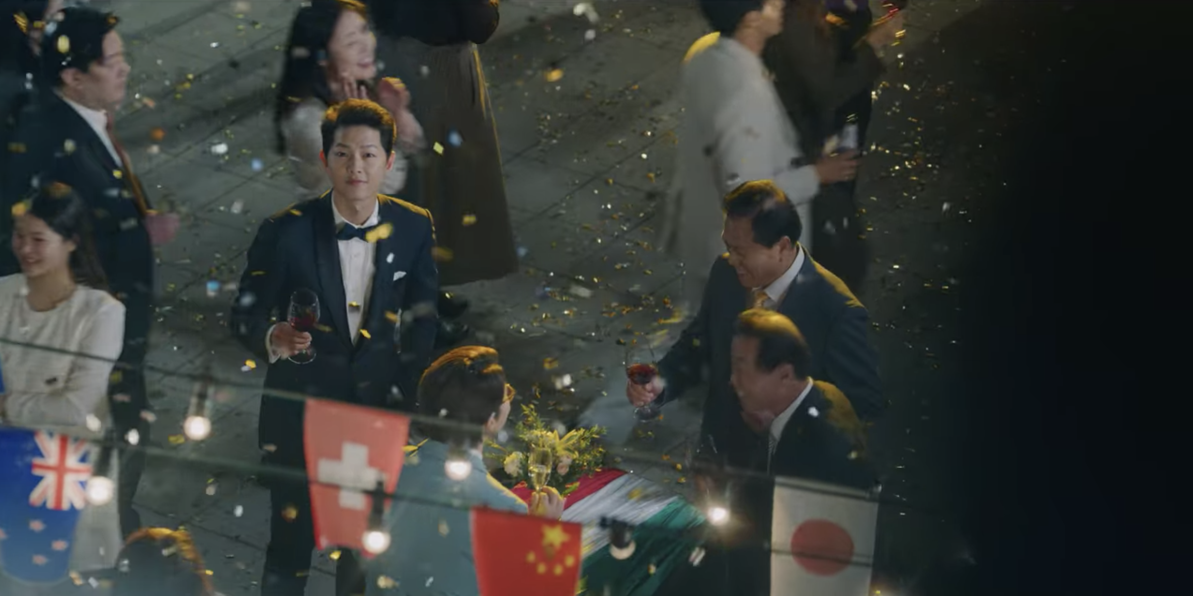 The mastermind behind the party is none other than Vincenzo and it turns out he did some research to come up with the idea of the party. In the meeting with the tenants earlier that morning, he proposed they throw a party right when the tenants were close to giving up on him. Thanks to the power of social media, Vincenzo invited everyone through a post he made on his SNS account which reached hundreds of people. Fast forward to the present and the party resulted into a huge hit. Cha-young is clearly fascinated with Vincenzo’s tactics and she likes the photo of his invitation on his SNS account. When Vincenzo finally notices Cha-young at the party, he smirks at her and twirls his cup of wine before extending the cup out towards Cha-young. She also smirks at Vincenzo in return, impressed with how quick-witted and intelligent he is. The two stand across from each other as everyone else celebrates in the background with music, dancing, fun, and confetti. Welcome to Vincenzo’s world.