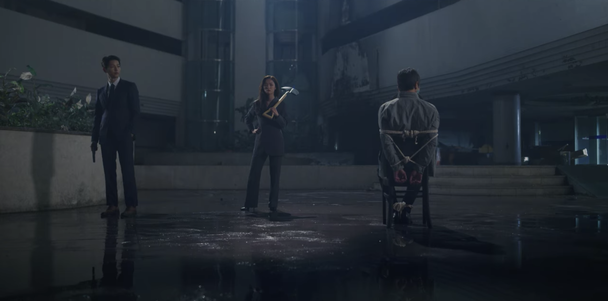 Vincenzo hangs out at a warehouse while keeping an eye on Mr. Pyo who’s busy gambling. It’s not until Mr. Pyo steps away to use the restroom that Vincenzo follows after him and knocks him out unconscious to take as hostage. Cha-young and Mr. Nam appear from the corner afterwards to clean up the mess, but it’s obvious they’re not as experienced at Vincenzo at this stuff. Cha-young refuses to touch the unconscious Mr. Pyo and leaves Mr. Nam behind to do the dirty work, lol. When Mr. Pyo awakens, he lures his boss to a secret location and it’s there that our three musketeers also manage to capture Mr. Pyo’s boss. When the two men awaken, they find themselves strapped down onto a chair with tape bandaged over their mouths. Vincenzo approaches Mr. Pyo’s boss with the gun that he found on him and utilizes the gun to threaten both guys to reveal who hired them to kill Lawyer Hong and Mr. Yoo. When the both of them refuse to speak up, Vincenzo shoots Mr. Pyo, causing him to fall over. Cha-young watches in horror as Mr. Pyo is shot, but it pushes Vincenzo to move forward with his next victim: Mr. Pyo’s boss himself. He aims the gun at the man’s head.