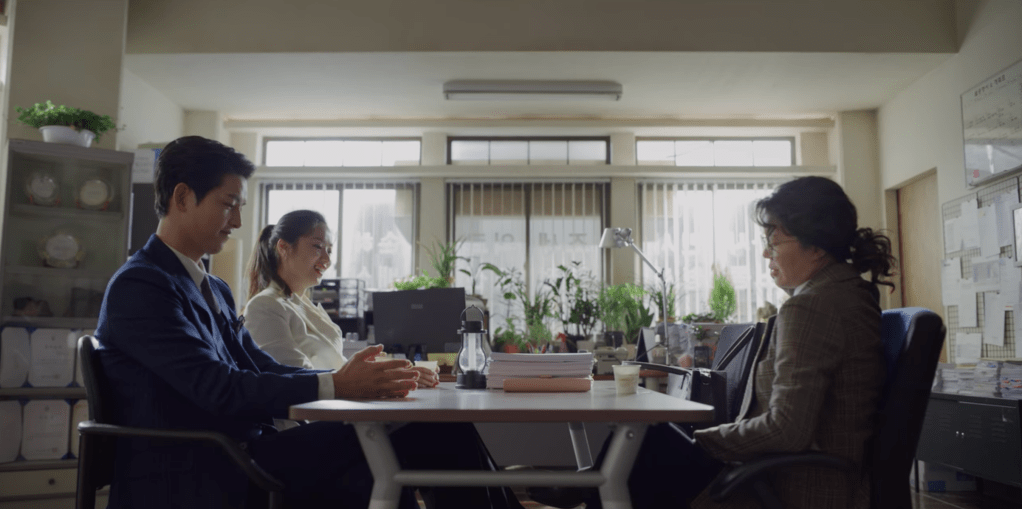 While walking out of the office, Lawyer Choi spots the real Vincenzo as he and Cha-young make their way towards Jipuragi. Upon noticing Lawyer Choi, Cha-young and Vincenzo quickly come up with a plan to distract her. Since he didn’t alter his voice when he threatened her at the laundromat, he is to pretend that his tonsils are sore and he’s unable to speak. So with that, they approach the Wusang lawyer and she’s introduced to Vincenzo. She’s not ready to leave just yet and she invites herself back inside of Jipuragi for some tea with Cha-young and Vincenzo. Cha-young makes sure to to let Vincenzo know that she will do all the talking. So warm cups of tea are served to all three (thanks to Mr. Nam Vincenzo) and Lawyer Choi attempts to trick our Jipuragi lawyers. She warns the two to lay low and to not do anything reckless if they wish to survive for long, just like the plant that she’s gifted them. She even tries to get Vincenzo to speak and say some words. Vincenzo does as Lawyer Choi wants and he does utter some words, but it’s unlike what she expected. He purposely raises his voice to be as high-pitched as possible and lets out a few words (OMG, I AM DYING!!). Lawyer Choi gets to hear Vincenzo speak, but she still feels suspicious about him (Song Joong-ki’s comedic timing is ON POINT!).
