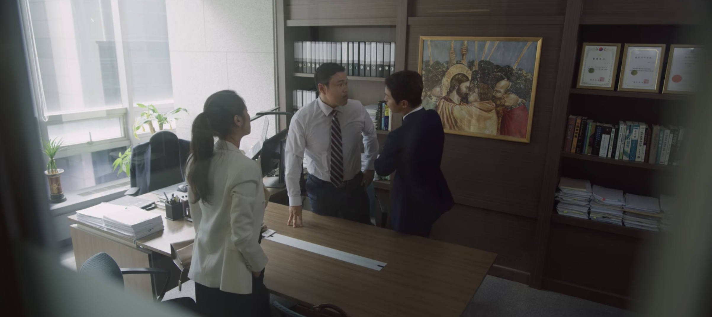 As their first step, Vincenzo suggests that they represent the family of the victims. Even though the first trial hearing is only five days away, he’s determined to make things work. Of course, it all starts with the lawyer, Mr. So. So our power couple stop by Mr. So’s office to talk him out of representing the victims. They assume he’s trying to get the families to settle for his own selfish and personal gain, but Mr. So denies all the accusations. He even comes up with excuses that neither Cha-young or Vincenzo buy. While Cha-young demands for Mr. So to send them a document announcing his resignation in representing the families, Vincenzo takes a good look around the office and is struck by a huge painting on the wall. He threatens Mr. So to give up or else Mr. So will end up on a deserted place where no one will be able to hear him or find him. Mr. So is petrified, but he pretends to play it off as if he’s not. Cha-young and Vincenzo make it clear that they’re here to fight and win. Period.