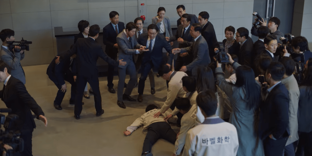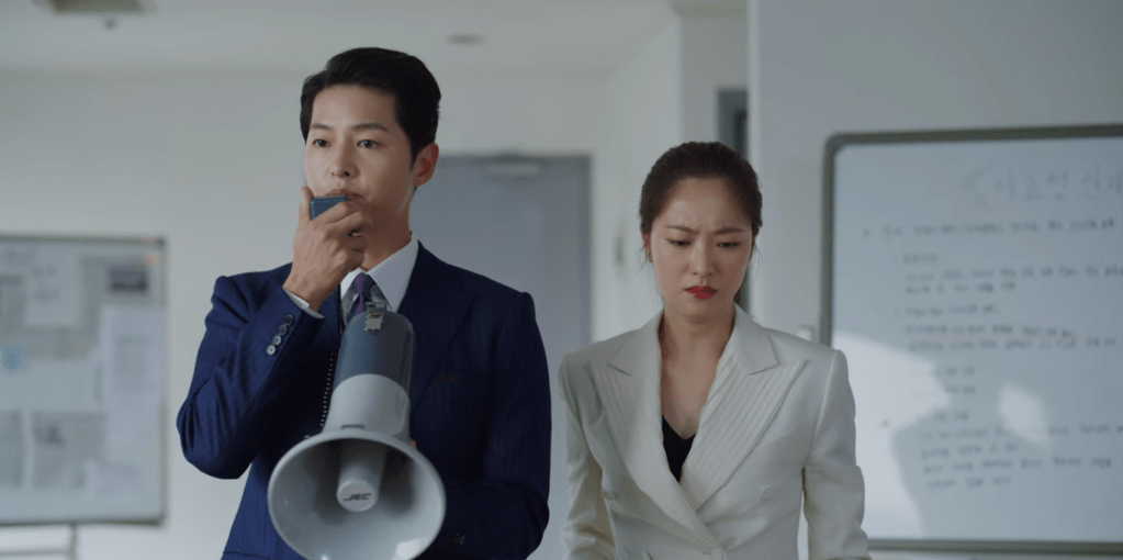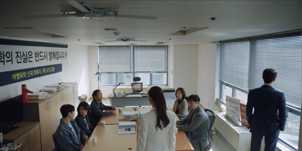 Mr. Han receives instructions from Han-seo to promote Joon-woo as a partner at the law firm. Mr. Han can’t seem to quite understand the decision, but he delivers the exciting news to Joon-woo who goes along with the joke. Joon-woo is to move into Cha-young’s office since he’s no longer an intern. Our three musketeers – Vincenzo, Cha-young, and Mr. Nam – all have a meeting to discuss Babel Chemicals. With the help of Mr. Nam who put the PowerPoint together, Cha-young explains to Vincenzo the situation involving Babel Chemicals. There has been 42 victims so far with 9 people dead because of the chemical, BLSD, that Babel Chemicals has been exposing their researchers to. As if that wasn’t bad enough, the lawyer representing the families of the victims – Mr. So Hyun-woo – has been pressuring the families to settle with Babel Chemicals which Cha-young believes is a set-up between Wusang and Mr. So. She also mentions the hospital that she believes is affiliated with Babel: Haemun medical center. Its Director, Gil Jong-moon, has been tricking the families into thinking that the hospital has nothing to do with Babel at all. Media also plays a big part in all of this as seen with Director Chun of Daechang Daily who demands all his journalists to write up positive stories about Babel so that he can get more advertisers in return. It’s all a dirty dirty business and Cha-young is ready to take them down.