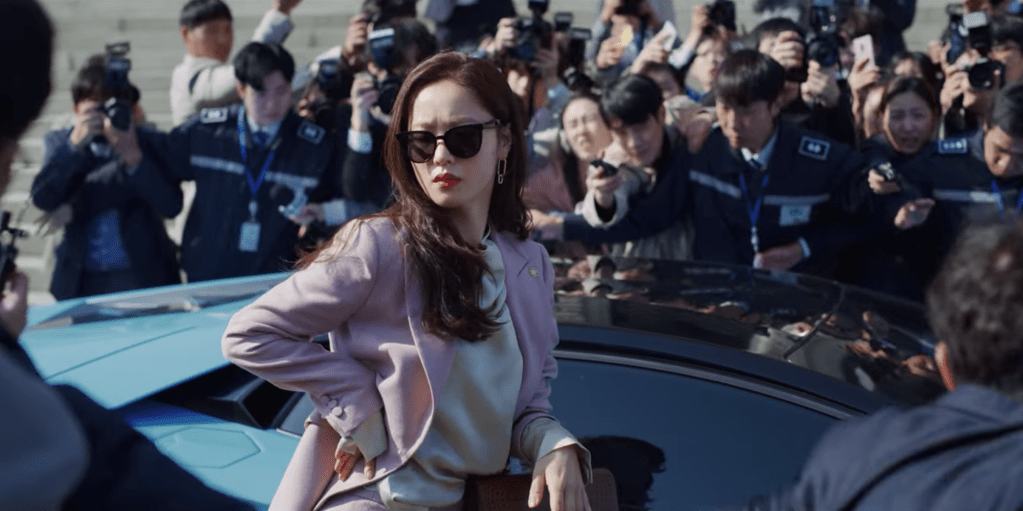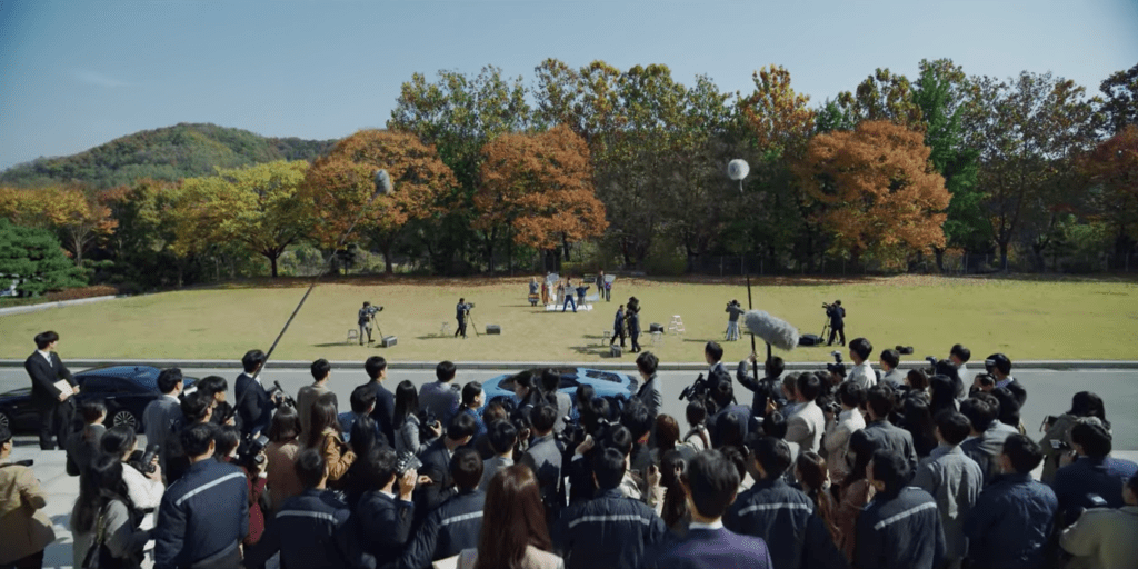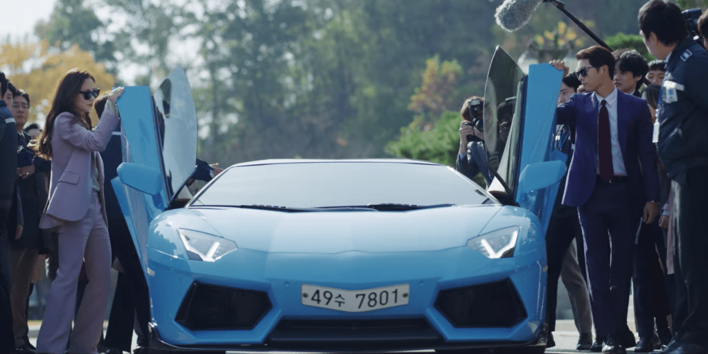 Wusang shows up first to the courthouse and they’re bombarded by the crowd of reporters and journalists waiting outside. Lawyer Choi says a few words of demeaning comments about the plaintiffs and how you should never believe the weak just because they’re weak. With that, everyone else waits for the actual important and relevant people of the lawsuit to show up and they grow curious when they see a small car appear at the entrance of the courthouse. Unlike what they expected, it’s not Cha-young and Vincenzo. It’s just another lawyer who’s upset at the crowd blocking her path and she barks at them to get out of her way, lol. A few seconds later though and our power couple do finally make their long awaited appearance. It’s all totally worth it and everyone’s eyes are fixed on Cha-young and Vincenzo. First off, Vincenzo’s car is a luxurious, rich, and pretty foreign car. Second, Vincenzo and Cha-young exit the car in the most extra and dramatic fashion. They’re confident, hot, and fierce and they really don’t care what others think. Cha-young makes sure to introduce herself to all the reporters and even strikes a few poses in between. The duo then make their way up the stairs towards the courthouse, but they’re not done just yet.