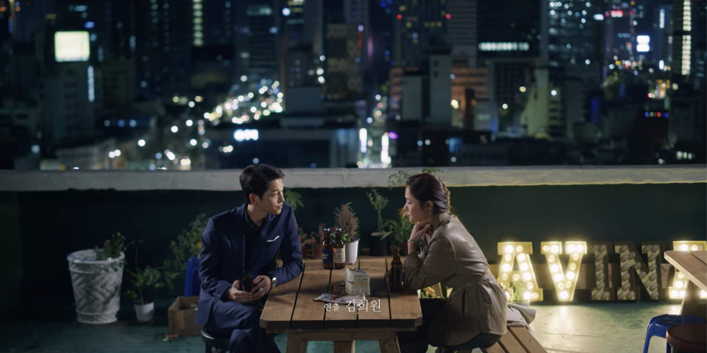 Later on that night, Vincenzo and Cha-young have an honest chat with each other on the rooftop of the plaza. Vincenzo admits that Cha-young’s got the greed and fight in her to win, but there’s more she needs to learn if she wants to win against Lawyer Choi and Wusang. He notes that it isn’t their goal to win the first trial hearing; they just gotta make sure that no one wins or loses. Vincenzo proposes that he’s going to teach Cha-young to be a real villain this time; in return, he is to also listen to Cha-young when she gives him advice. The two strike an agreement before focusing their attention back on Mr. So. What happened to him anyways? Vincenzo follows through with his words and just like he stated he would, Mr. So ends up deserted and alone by the river across from his apartment complex. He calls out to his wife, but his wife is busy reporting his disappearance and can’t hear him. Omg, lol.