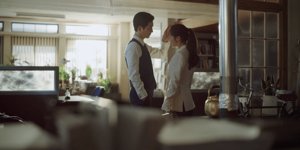 So with that, our power couple retreat to their second home, Jipuragi, only to bid farewell with Mr. Nam who prepares to head out for a blind date. After he leaves, Cha-young and Vincenzo are left alone and Vincenzo wants Cha-young to keep her promise. They did have a bet earlier and Cha-young did lose the bet. Vincenzo warms up and prepares to give Cha-young a good finger flick on her forehead. Cha-young reminds Vincenzo of his rule about not hitting women, but she’s the exception this time. So with that, Cha-young drags her feet towards Vincenzo and squeezes her eyes shut. She assumes she’s going to feel a flicker of pain across her forehead within any second. Vincenzo focuses in on his target and places his finger right in the middle of Cha-young’s forehead. He’s about ready to strike, but instead of focusing on his finger flicking skills, he studies Cha-young’s face and slightly smirks at how adorable she is (EEEEEK, I’M SQUEALING SO HARD RIGHT NOW. I LOVE THIS SCENE SOOOO MUCH!). In the end, he does unleash a finger flick on her forehead, but it’s a soft and weak one (AWW, HE WENT EASY ON HER!! Who knew finger flicking could be so romantic?!).