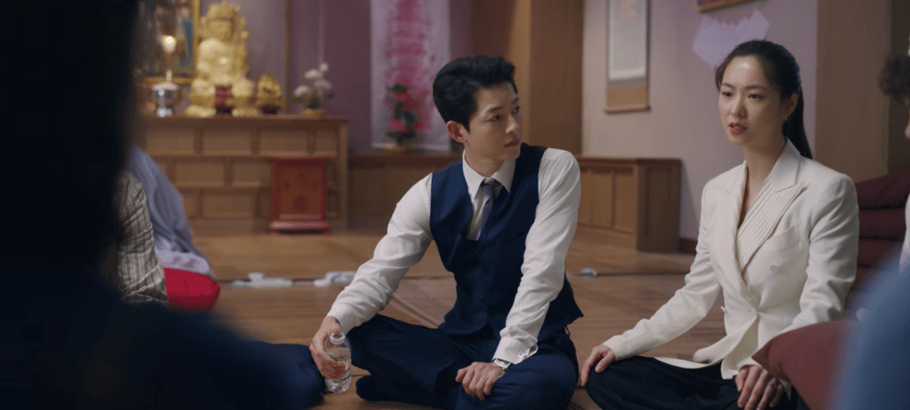 Just then, Mr. Tak enters Jipuragi and volunteers to take care of the clothes that our two lawyers will be sporting to the first trial hearing (awww!). He irons their clothes out so well Vincenzo and Cha-young are clearly satisfied with his great work. The other Geumga tenants also show their support for our power couple in their own ways. Chef Toto has some food prepared for Vincenzo, but it’s made by his mother with her special touch. Vincenzo actually doesn’t spit out the food this time and he gives Chef Toto a thumbs up. Haha. Even our monks are in the temple praying for Cha-young and Vincenzo’s win. And so the two embark on their first trial hearing together as a team. Things are going great until Cha-young forgets her car keys, but Vincenzo is always prepared. He has his own car that they can use to show up to the party.