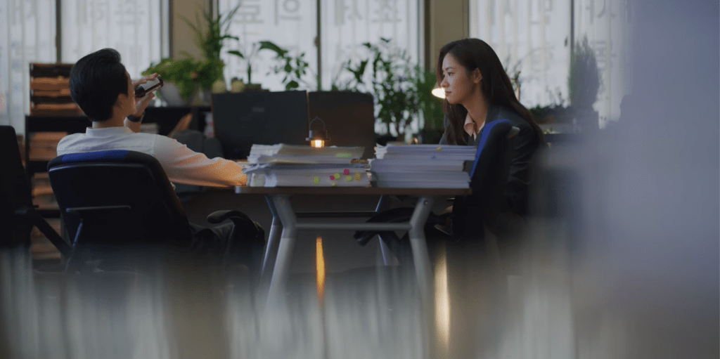 Cha-young, Vincenzo, and Mr. Nam come up with their game plan for the first trial hearing. They can’t postpone the trial as it’s too late, but Vincenzo has another trick up his sleeve. Who says they have to do it before the trial? They can invalidate the trial during the trial, no? So our trio stay up late into the night and work together to prepare. When morning hits, our power couple sit down and have a casual conversation with each other about the lawsuit and Vincenzo’s plans after everything ends. Since he doesn’t have any attachment to the country, he plans on leaving once things wrap up. Cha-young seems a bit disappointed by Vincenzo’s response, but it’s obvious that he himself isn’t so ready to leave just quite yet. A part of him might be second guessing himself at this point.
