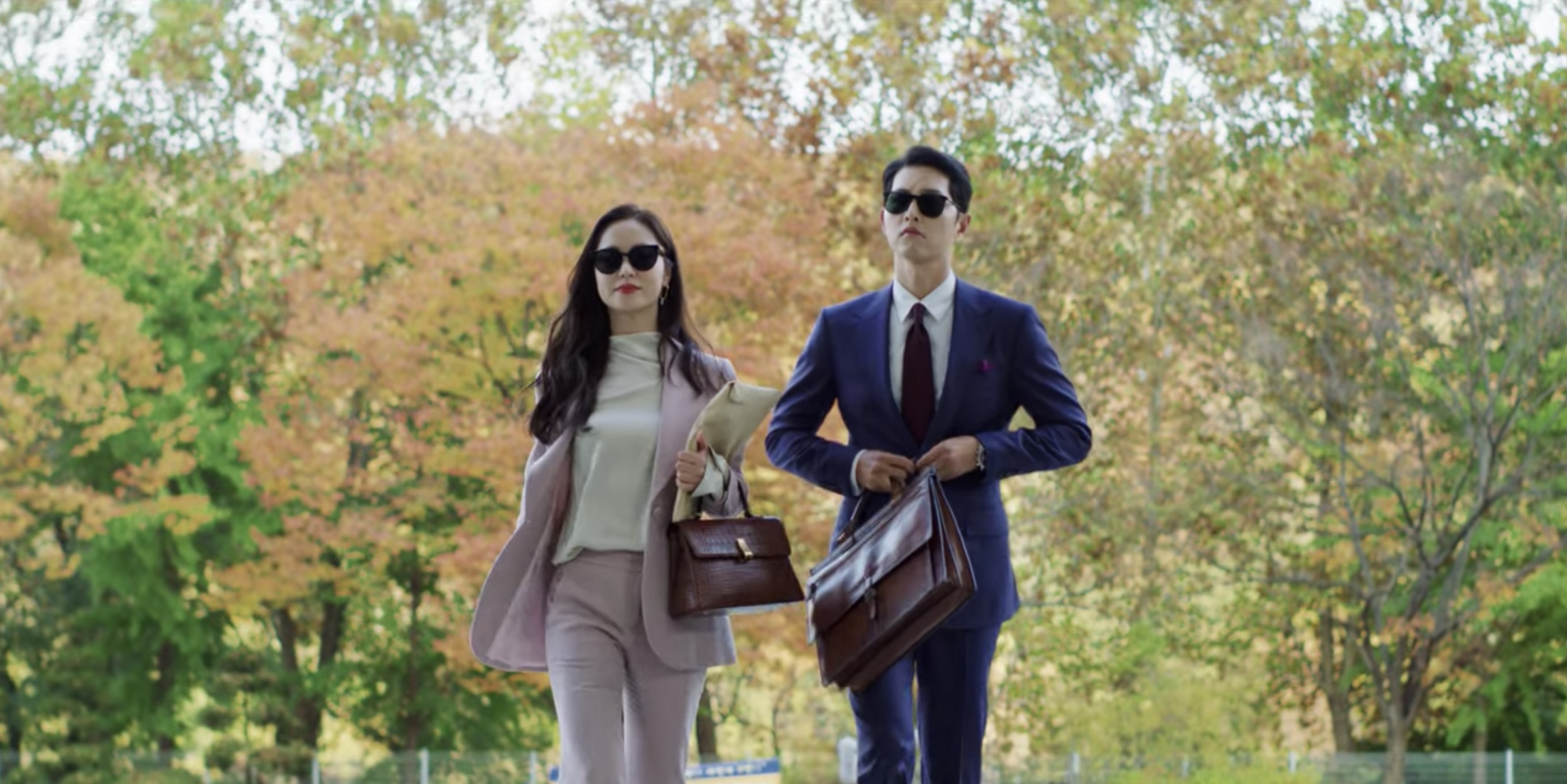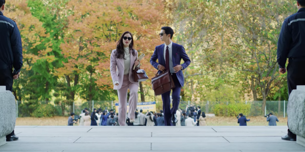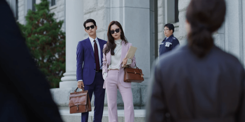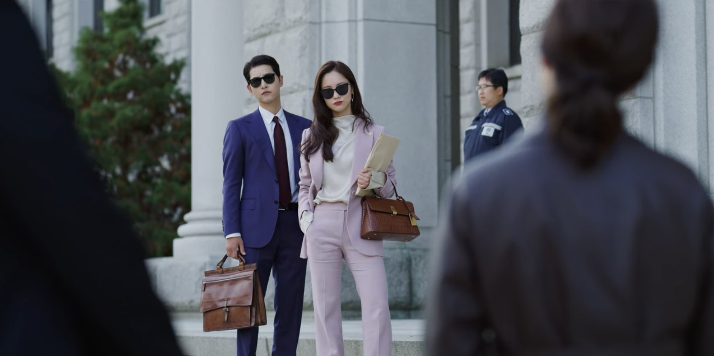 At the top of the stairs, the duo turns around so Vincenzo can take off his sunglasses and deliver his iconic Italian line, “Only evil can punish evil.” Everyone’s eyes then dart across the street towards the protest and demonstration that our Geumga tenants have put on. While the reporters and journalists rush over to capture the demonstration, our two Jipuragi lawyers stay where they are — impressed and proud. They give the tenants a thumbs up before proceeding into the courthouse. Of course, it wouldn’t be a battle without some provoking and Cha-young and Lawyer Choi taunt each other through their face expressions and gestures. Cha-young merely winks at Lawyer Choi before smiling slyly and walking alongside Vincenzo into the courthouse.