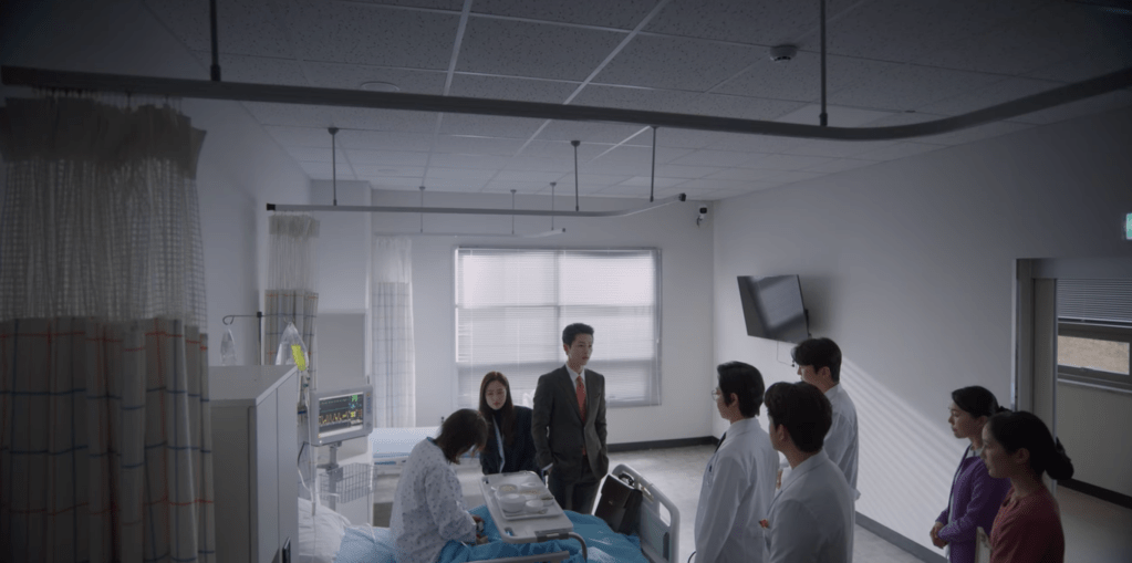 Cha-young and Vincenzo munch on some semi-burnt sweet potatoes during their meeting. After feeding Vincenzo some potatoes, Cha-young focuses her attention on the documents that Mr. Nam has prepared on Han-seo’s older brother, Han-seok. He’s resided in the United States for 15 years so they assume that he didn’t even attend his father’s funeral that happened two years ago. Vincenzo also happens to smudge his nose with a black mark from holding the burnt potato. No one tells him anything though and Cha-young panics when she realizes the superstition affiliated with eating potatoes. Apparently, eating sweet potatoes causes a roadblock to your plans. With that, she throws down her potato and transitions to visiting Ms. Oh at the hospital. Vincenzo initially declines the invitation, but it isn’t until Mr. Nam speaks pitifully about Ms. Oh and the lack of responsibility from her kids (if she had any) that Vincenzo changes his mind, lol.