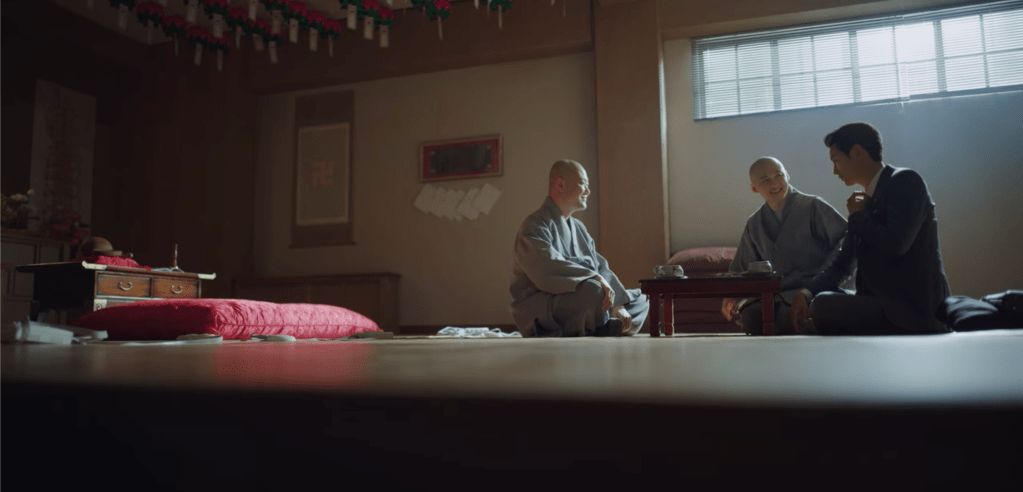 Meanwhile, Vincenzo steps out to catch up with Mr. Cho. Mr. Cho’s operation to grab Mr. Wang’s iris data in China is successful and now they can access the gold storage room much easier. However, there’s still one thing standing in the way of their plan: the temple in the basement sitting on top of the room. So Vincenzo makes his move and he stops by the temple back at Geumga Plaza. He finds Mi-ri inside along with Monk Chaeshin and Jeokha. After Mi-ri exits, Vincenzo sits down to have a talk with Monk Jeokha and offers to relocate them to a much nicer place. However, Monk Jeokha is content with their current location inside of Geumga and refuses to move anywhere. As if things couldn’t be bad enough, Monk Chaeshin serves some sweet potatoes for them all to eat. Hahaha. Vincenzo isn’t so happy with either monks and he refuses to be fed by Monk Chaeshin. What all three men are unaware of is Mi-ri hiding outside the temple listening in on their conversation. If Vincenzo is willing to relocate the Geumga monks to another temple, that must only mean one thing.