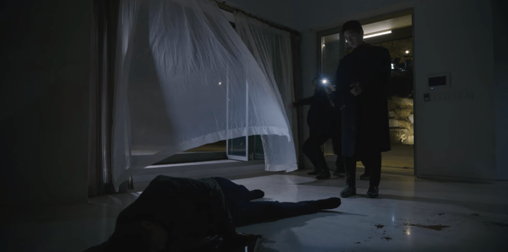 The trio set out on a trip of their own and head to the house that Director Gil had been stationed at for protection by Prosecutor Jung’s team. Upon arrival, they notice that things are a little suspicious as they don’t see any of the cops dressed in plain clothes that were hired to protect Director Gil. Still, the three inch closer to the house but it’s unlike what they were expecting. The house is dark and there are two dead bodies soaked in blood in the house. So what about Director Gil? What happened to him? When Vincenzo opens the door to Director Gil’s bedroom, they find him laying in a pool of his own blood, stabbed in the chest with a knife. Our Jipuragi team was too late. As if things couldn’t get any worse, Cha-young receives a text from one of the family members at that moment that reads,