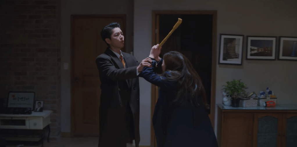 Vincenzo fights against both guys and it’s obvious the two are no match for the Mafia lawyer. After beating both guys down, he quickly checks in on a frightened Cha-young, but the break doesn’t last for long. One of the guys slings his hammer towards their direction so Vincenzo lunges at Cha-young and together the two land on the couch. With that, the two guys make their escape and Vincenzo is determined to find out who the mastermind behind the order is. However, Cha-young pleads for Vincenzo to stay with her. She’s scared to death and it’s already obvious who was behind the attempted murder.