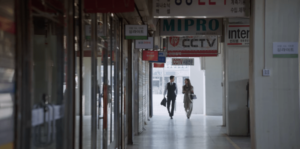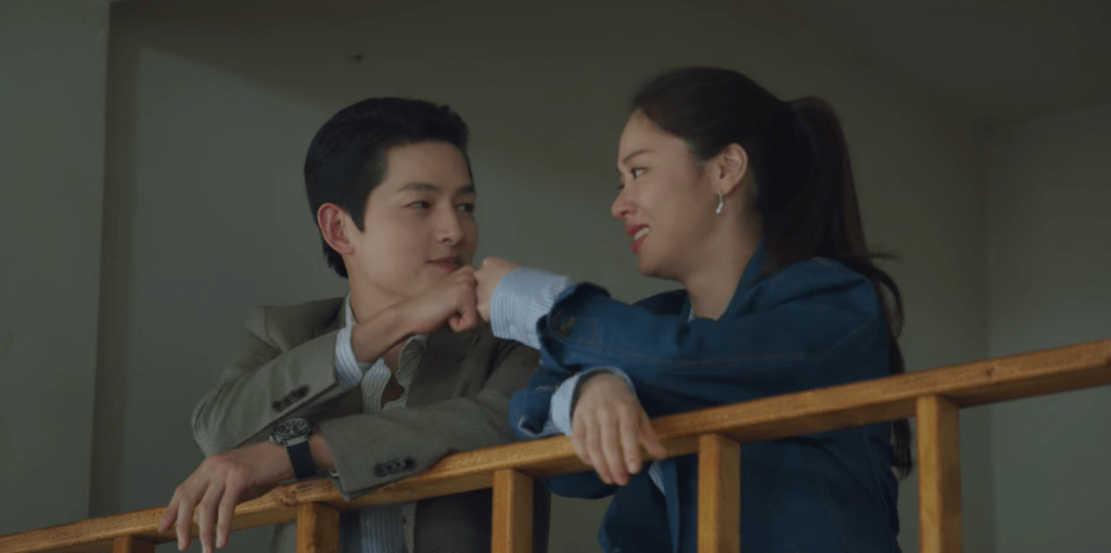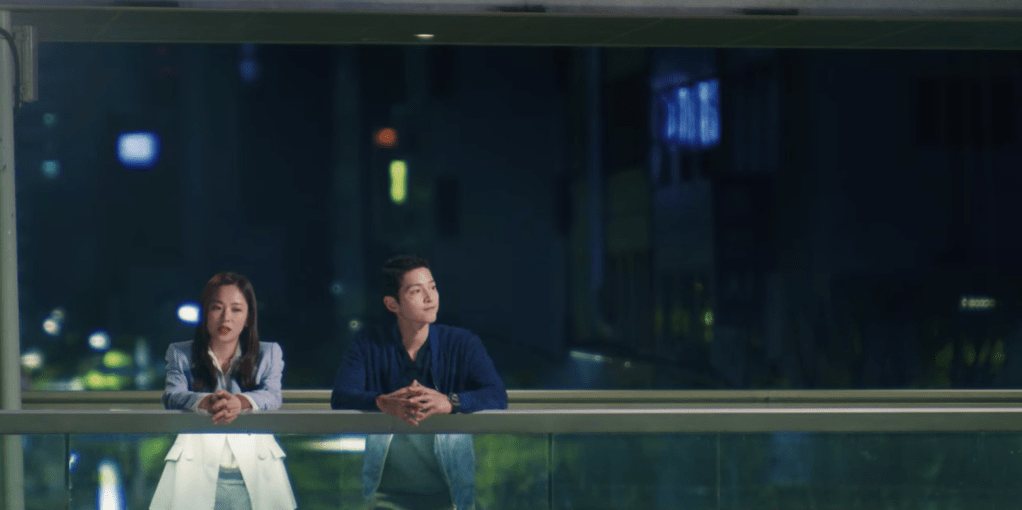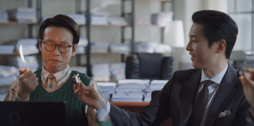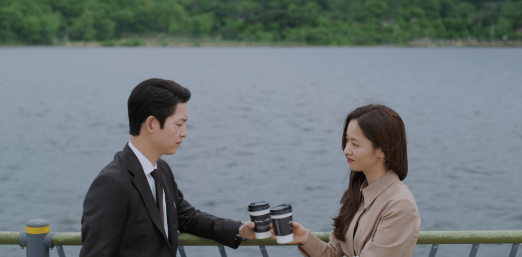 Cha-young and Vincenzo spend some time together drinking some coffee outside. After chatting a bit about corruption and how competent corrupt people can be, Cha-young moves on to checking in with Vincenzo once again about leaving Korea. The thought of Vincenzo leaving Korea after everything is over still weighs heavily on Cha-young’s mind and it’s obvious she’s not quite ready to let him go. However, Vincenzo makes a promise with Cha-young that he’ll definitely come back. Although it’s not explicitly mentioned, it’s clear Vincenzo will come back for her. Omg, stay still my heart. I love them both so much!