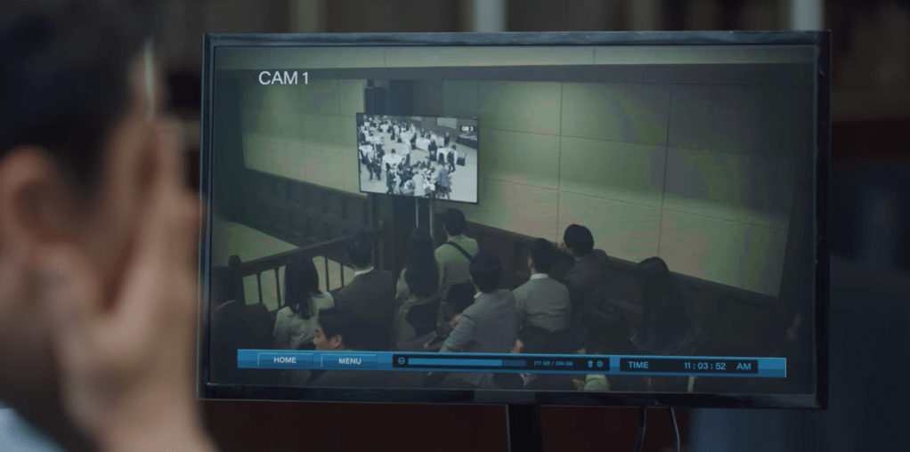 And so the first day of the trial is underway. Our Cassano family all have a pep talk at Chef Toto’s restaurant first before heading out to the courtroom. Once inside of the courtroom, our Cassano family all sit together in the front of the room and Han-seo joins them shortly afterwards. Unlike everyone else in the room, they don’t stand up when Judge Heo enters the courtroom and instead they sit with their arms and legs crossed. I love this silent protest! The trial to settle compensation for damages caused by Babel’s illegal activities begins and Vincenzo is the first witness to testify. He uses video evidence of the gathering at Joon-woo’s house as well as the Babel Tower auction as part of his testimony. While the footage plays in the courtroom, there’s one thing about the video that stands out to the Babel-Wusang team. Their faces are blurred. Lawyer Choi, Mr. Han, Han-seo, and Joon-woo’s faces are blurred in the videos. Why is that? Cha-young and Vincenzo can only smirk at the playing of the video. They aren’t here to play any games.