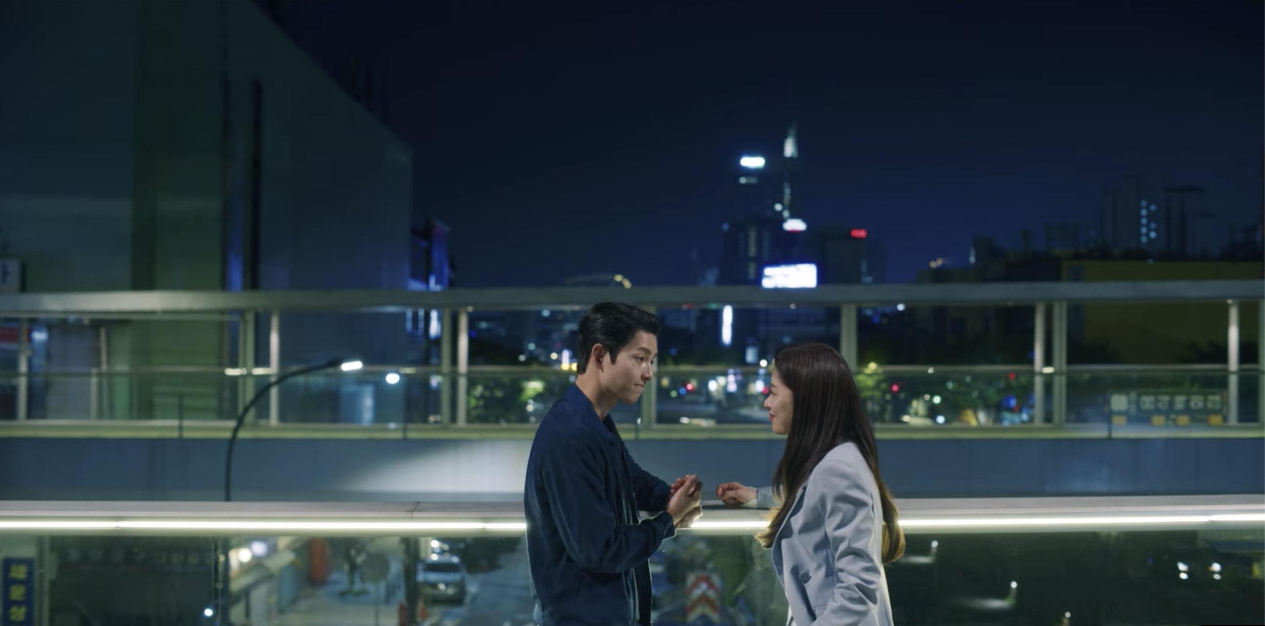 Later on that night, Vincenzo and Cha-young spend some time together outside on the balcony of a building overlooking the plaza. It’s the same exact place they were located on the night that Vincenzo threw his infamous Geumga Plaza party to avoid Mr. Park, Soo-nam, and their men. A lot has changed since that party, but Cha-young and Vincenzo’s feelings remain the same. Just like Cha-young felt then, she still thinks Vincenzo is cool. She also clearly remembers the Booralro suit that he sported on that night and Vincenzo was fascinated at how someone recognized the expensive and luxurious suit he was wearing. Cha-young’s grateful that Vincenzo is back and that he settled his situation back in Italy with some money. Now that Vincenzo is back, things can return to like how they were and she can breathe a sigh of relief. Omg, my heart is fluttering with this scene. They are waaaaay too cute, I can’t handle! Meanwhile, Mr. Kim finds himself abandoned and deserted on the side of a train-track with a fake gold bar in his hand, lol.