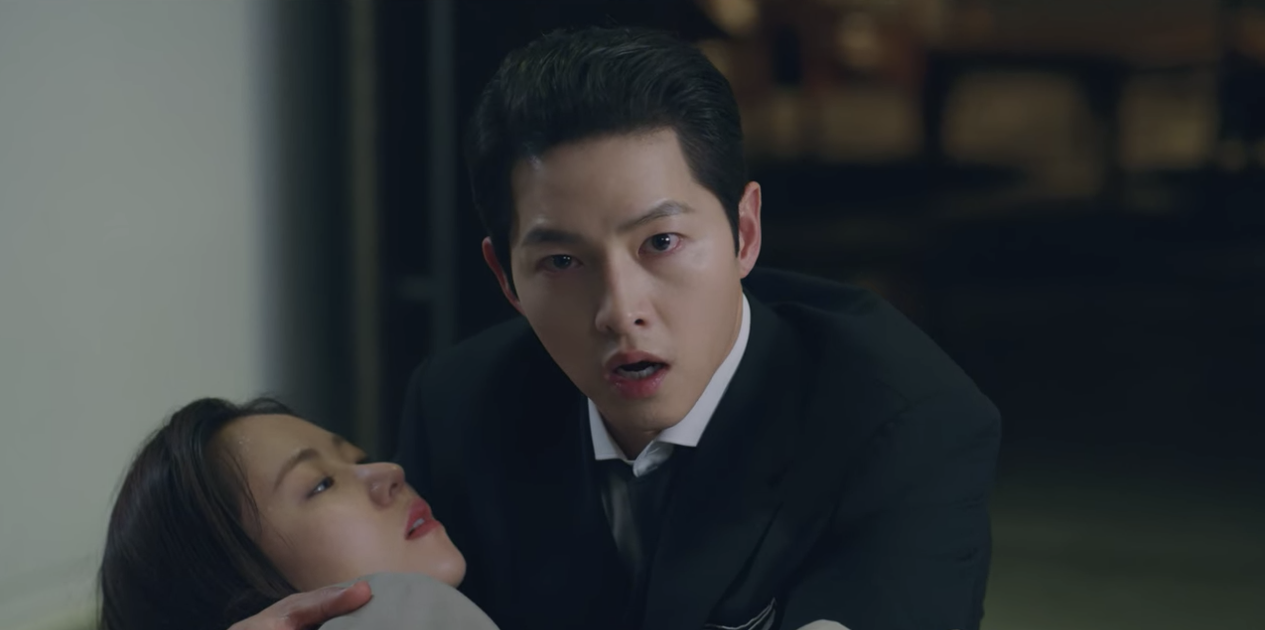 Han-seo apologizes in advance for the injuries and wounds he’s about to inflict on Vincenzo, but Vincenzo is understanding. He knows that Han-seo has no other choice. Han-seo picks up the hockey stick and prepares to hit Vincenzo, but he switches his aim at the last second and instead hits Joon-woo with the stick (OMG!! GO HAN-SEO!!). With Joon-woo distracted and hurt, Vincenzo utilizes the opportunity to untie Cha-young and rescue her. Unfortunately, the fight with Joon-woo doesn’t last too long for Han-seo and he’s shot in the arm and another bullet is heard exiting from Joon-woo’s gun. After fighting Han-seo off, Joon-woo targets Vincenzo next and shoots at the Mafia lawyer. However, his bullet ends up piercing Cha-young who sacrificed her life for the Mafia member by standing in front of him to protect him. She’s shot in the back by the bullet and she falls to the ground seconds afterwards. Both Cha-young and Vincenzo remain speechless and they’re both in shock at the incident. Vincenzo embraces a wounded Cha-young in his arms and the Mafia side in him is once again riled up. There’s been many things in the past that Joon-woo’s committed that has angered Vincenzo, but witnessing his love get shot right in front of his eyes hits different. He lost his mother and he now might lose his lover. As Vincenzo holds Cha-young in his arms, he looks back up at Joon-woo with no mercy. The hungry cat is ready to feast on his mouse.