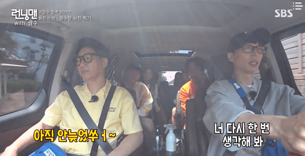 On the way to the bus, the members walk along a path surrounded by flowers and snap a photo together. Just like the scenery itself, we hope that Kwang-soo and Running Man will always walk on a flower path. With that, everyone reconvenes on the bus to their next destination. They crack a few more jokes before resuming their next mission: a prank phone call to one of Kwang-soo’s friends or acquaintances. If they can pretend to be Kwang-soo during the call and succeed in tricking the person that it’s Kwang-soo they’re talking to, our team will win. With that, Suk-jin is chosen for the special challenge and the person he calls is actor Ahn Bo-hyun (from ‘Itaewon Class’). Bo-hyun texted Kwang-soo the other day upon hearing about his departure from the show so the members seize the opportunity to contact him for the game.